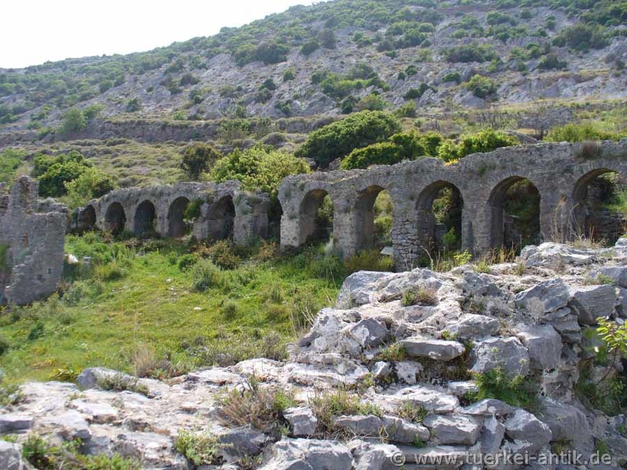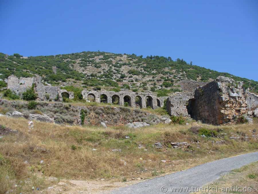 ausgeschmückt, von denen noch Reste zu sehen sind. In der Stadt selbst sind noch Reste eines Theaters für etwa 1.500 Zuschauer, eines Odeons (oder Bouleuterions) mit etwa 900 Plätzen, dreier Bäder und einer in Nord-Süd-Richtung verlaufenden Säulenstraße zu erkennen. Betrachtenswert sind die Mosaike im Odeon, die sich in einem Gang unter den Zuschauerrängen befinden. In einem der Bäder kann man noch die Wasserversorgung erkennen; es gibt ein Warmwasserbecken, das durch ein Feuer unter dem Steinbecken erhitzt wurde.