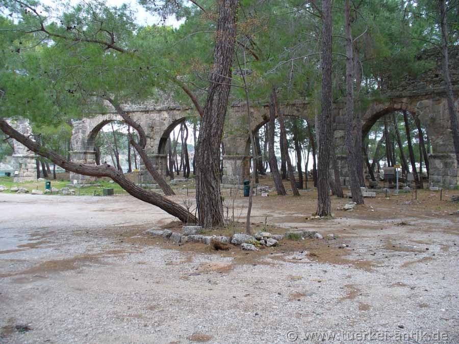 Chr. dem Lykischen Bund eingegliedert. Ihre Blütezeit hatte die Stadt in der römischen Epoche, wo sie als blühendes Handelszentrum bekannt war. Von hier aus wurden speziell Holz, Rosenöl, aber auch Parfüms und duftende Creme exportiert. Obwohl Phaselis bis in byzantinische Zeit eine Flotten- und Handelsbasis mit einigem Wohlstand war, ist der heutige Baubestand nicht sehr imposant. Die Seldschuken hatten die Stadt als Steinbruch für die Erweiterung der Befestungsanlagen Antalyas benutzt. Erhalten ist ein Theater, ein Aquädukt und eine Prachtstraße, die quer über die Halbinsel zwischen dem einstigen Galeerenhafen und dem Handelshafen verläuft. Die Akropolis der Stadt ist bis heute nicht ausgegraben. |