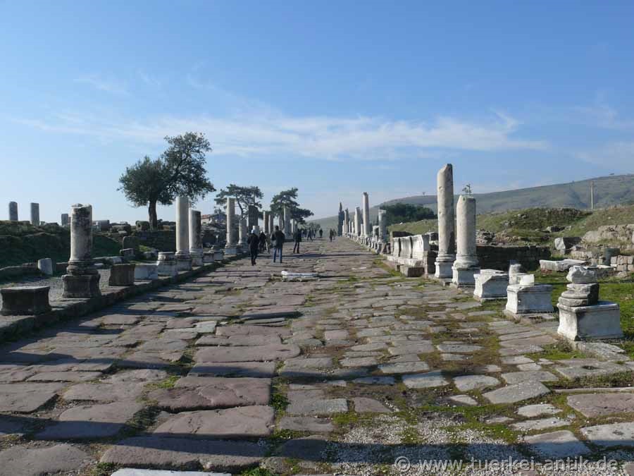 Den Zugang zum Asklepieion ermöglichte eine 820 Meter lange prunkvolle Straße, die zumindest in ihrem ersten Teil, hatte man einen den Zugang bildenden Torbau durchschritten, als via tecta überwölbt war. Säulenhallen begleiteten die bis zu 18,50 Meter breite Straße auf beiden Seiten. |