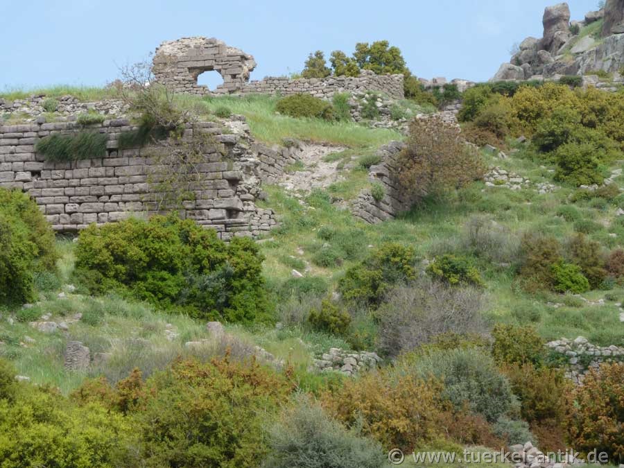 Im Stadtgebiet, an den Hängen zwischen Agora und Meer, sind heute noch die Agora mit auf zwei Seiten umgebenden Hallen, das Buleuterion, das Gymnasion, das Theater und eine römische Therme erhalten. Außerhalb der Stadtmauer liegt eine gut erhaltene Nekropole mit Grabbauten und Sarkophagen. |
