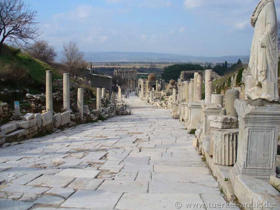 Erste Besiedlungen im Stadtgebiet gehen in die Zeit um 5000 v. Chr. zurück. Im 2. Jahrtausend v. Chr. wird in hethitischen Texten eine Siedlung Apasa im Land Arzawa erwähnt, die wahrscheinlich mit dem späteren Ephesos identisch ist. Etwa ab dem 10. Jahrhundert begann die Besiedlung durch ionische Griechen. 296 v. Chr. wurde Ephesos an die heutige Stelle verlegt. Seither war Ephesos eine große Hafenstadt, die nach 133 v. Chr. dem Römischen Reich einverleibt wurde. Zunehmende Verlandung verschob die Küstenlinie, so dass Ephesus heute mehrere Kilometer landeinwärts liegt. Die Stadt verlor an Bedeutung. Als die Seldschuken 1090 n. Chr. die Stadt eroberten, hatte sie das Format einer Kleinstadt. Nach einer kurzen Blütezeit wurde die Stadt im 14. Jahrhundert völlig verlassen. |