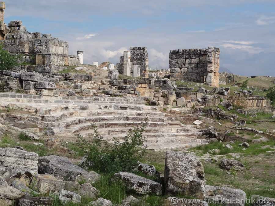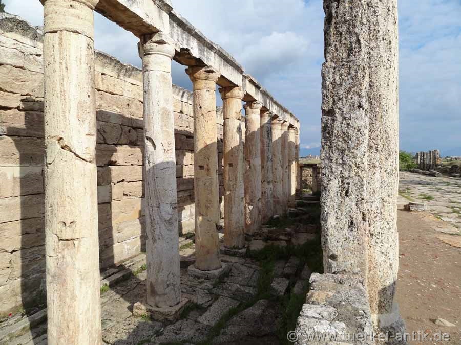 sind erhalten. Ebenfalls in unmittelbarer Nähe der Ruinen des Apollontempels befinden sich die Überreste eines monumentalen Nymphaeum, einer Brunnenanlage aus römischer Zeit. 600 anstrengende Meter über dem Theater befindet sich das Martyrium des heiligen Phillip, ein quadratischer Grabbau mit einer Kantenlänge von 60 Metern. Da ein Grab nie gefunden wurde, ist nicht gesichert, dass der Heilige hier wirklich bestattet wurde. Das Gebäude wurde Anfang des 5. Jh. n. Chr. errichtet und 100 Jahre später durch ein Erdbeben zerstört. Vom "Antique Pool" aus führt die einstige, von Kaiser Domitian gestiftete Säulenstraße nach Norden. Die streckenweise mit Marmorplatten gepflasterte Straße, die Via Frontinus, war die Hauptstraße Hierapolis und führte vom Südtor durch die ganze Stadt bis hin zum Frontinus-Tor mit seinen beiden runden Türmen. In byzantinischer Zeit war der Stadtkern von einer Mauer umgeben worden. Auf der Höhe der einstigen großen Agora wurde über der Säulenstraße ein Wehrtor errichtet. Vor dem Frontinus-Tor befinden sich die Ruinen einer großen Thermenanlage, die im 5. Jh. n. Chr. in eine Basilika umgewandelt wurde. |