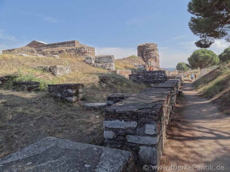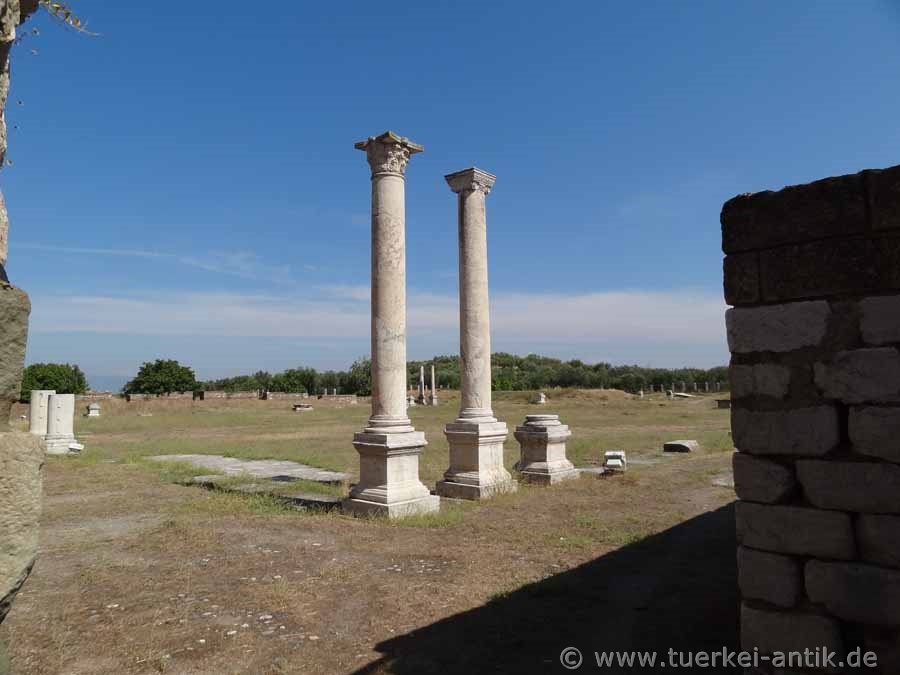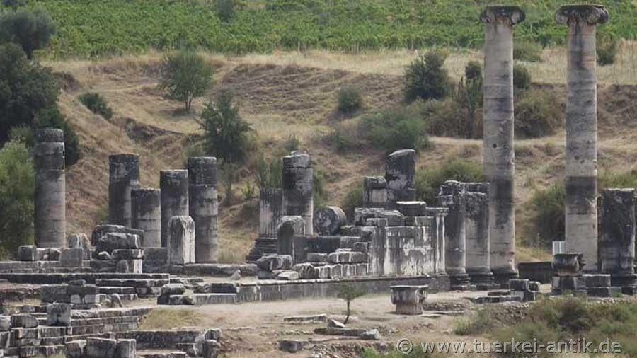 Auf der südlichen Straßenseite im griechischen Sardes steht der Artemistempel, erbaut vom 4. bis 2. Jahrhundert v. Chr., der in seinen geplanten Ausmaßen an die Tempel von Ephesos und Didyma heranreichen sollte, jedoch nie vollendet wurde |