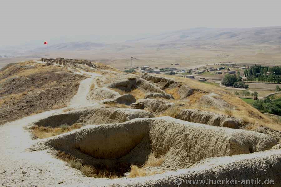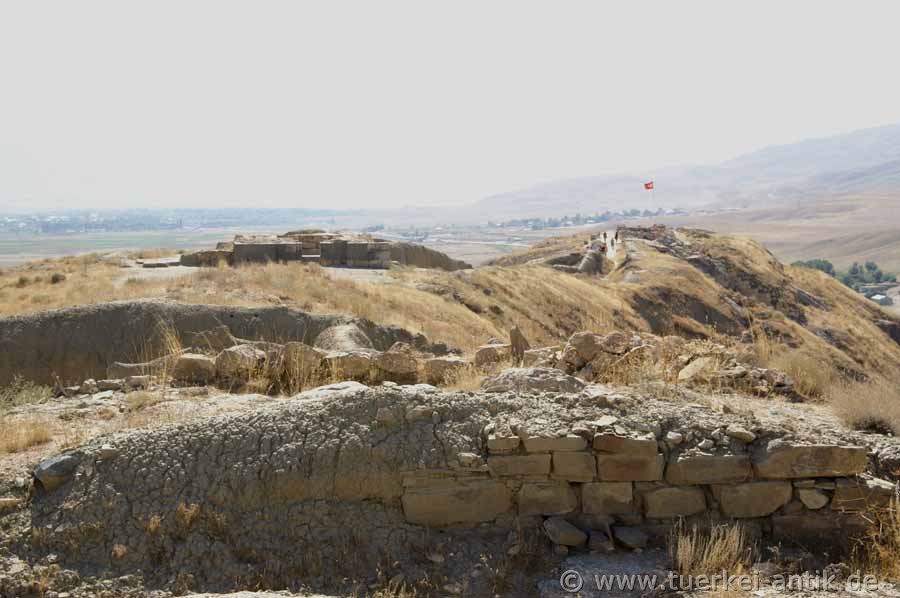 Die Festung wurde im 7. Jh v. Chr. zerstört. Im Mittelalter wurden Steine der Festung zum Bau von Häusern benutzt. Das Königreich Urartu war im 1. Jahrtausend v. Chr. ein Königreich im Nordosten Kleinasiens, im Grenzbereich der heutigen Staaten Türkei, Armenien und Iran. Die meisten Forscher gehen davon aus, daß das Reich bereits im 6. Jh v. Chr. sein Ende fand. Zu einer endgültigen Beurteilung des Endes von Urartu sind insgesamt mehr exakte Daten nötig. Mit dem Ende des Reiches verschwindet auch die urartäische Sprache. |
