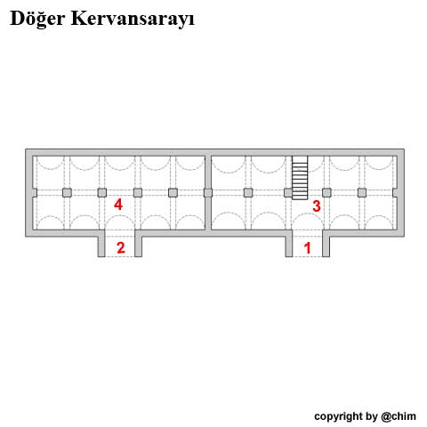 Die Karavanserei Döger Han, ein Bau aus osmanischer Zeit, wurde im Jahre 1434 unter Sultan Murat II. gebaut. Sie unterscheidet sich deutlich von den älteren seldschukischen Karawansereien, wie sie z.B. an der Mittelmeerküste zu finden sind. Diese verfügten in der Regel um eine große Anzahl offener Zellen, die um einen großen offenen Hof gruppiert waren. Oft verfügten sie zusätzlich über eine kleinere, geschlossene Halle. |