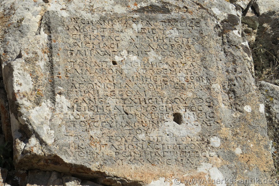 Rechts unterhalb des Grabmals befindet sich eine eingelassene Inschrift, von der Prof. Dr. Hasan Spring von der Selçuk Üniversitesi in Konya sagt, es sei ein Denkmal für den römischen Reiter Lukuyanus, der den Tod in einem frühen Alter fand. |
