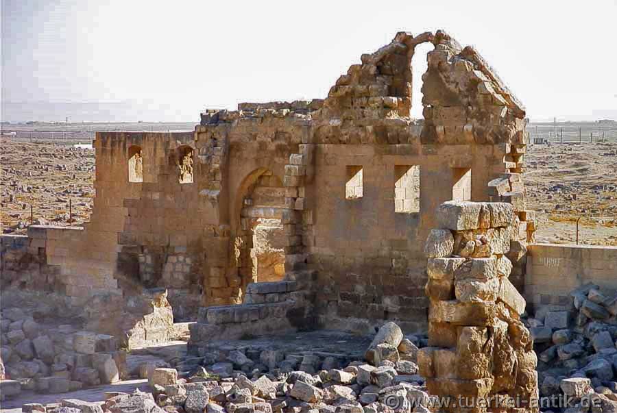 Viel ist von der einstmals stolzen Stadt nicht mehr zu sehen. Was wir sehen, sind die Reste einer großen Omayadenmoschee, wie sie noch heute in Aleppo und Damaskus zu finden sind und der ersten islamischen Universität. Das auf dem Fotos sichtbare Tor soll beide Komplexe verbunden haben. Der Steinbruch von Harran und die Han al-Ba'rur Karawanserei sind ebenfalls noch erwähnenswert. |