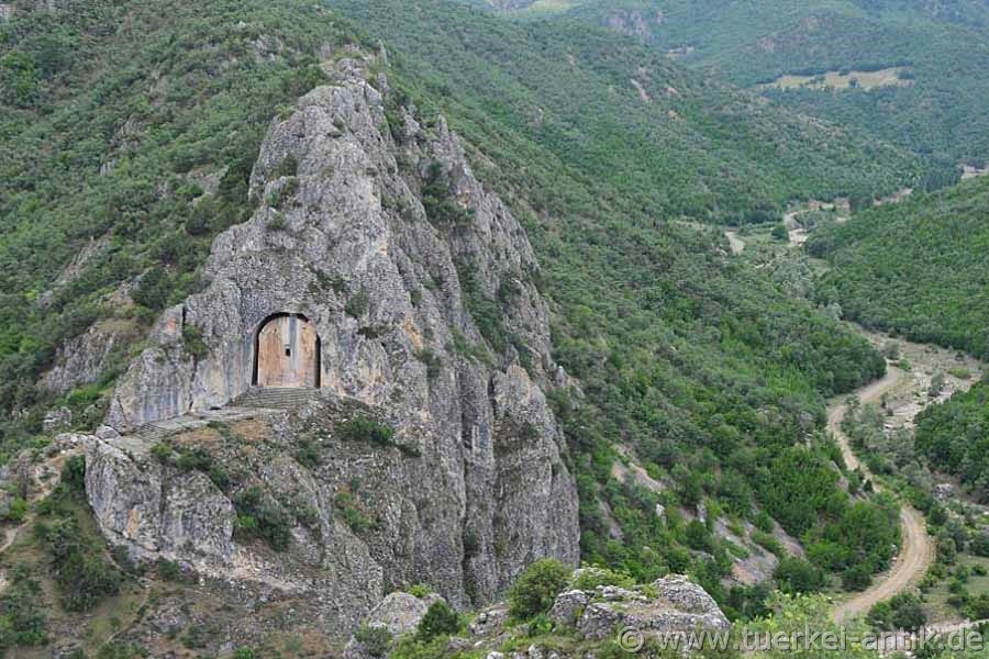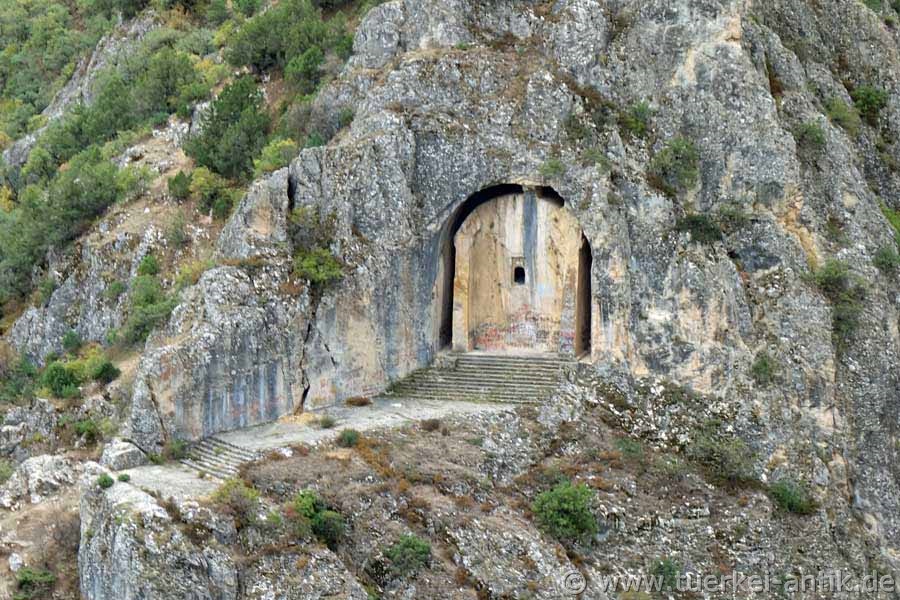 Das hellenistisches Felsengrab des Kommandanten IKEZİOS aus dem 2. Jh. v. Chr. befindet sich etwa 27 km nördlich von Çorum in einem steilen, felsigen Tal. |