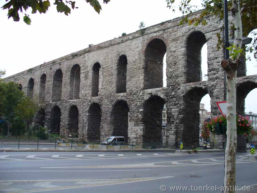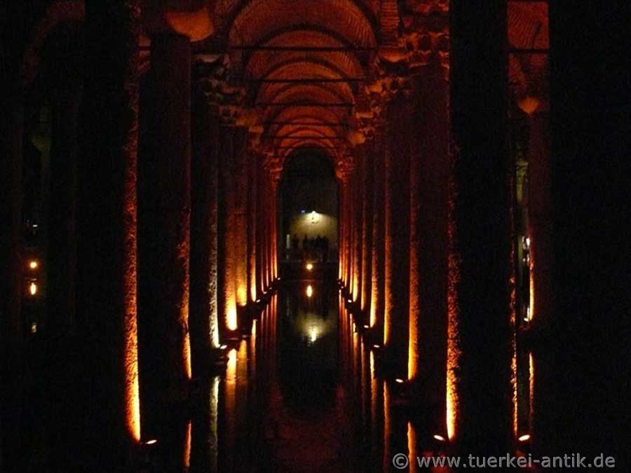 Die Yerebatan Zisterne (Yerebatan Sarayı) neben der Hagia Sophia wurde unter Kaiser Justinian errichtet. Dieser ließ die Zisterne zwischen 532 und etwa 542 als Wasserspeicher für den Großen Palast angelegen. Darüber befand sich eine große Basilika, daher wird die Zisterne auch cisterna basilica genannt. Sie hat ein Fassungsvermögen von ca. 80.000 Kubikmetern. Zwölf Reihen von 28, insgesamt also 336 jeweils acht Meter hohen Säulen mit überwiegend korinthischen Spolienkapitellen tragen das Gewölbe. Das Wasser, das in bester Qualität aus dem Belgrader Wald im Hochland westlich von Istanbul über die Viadukte des Hadrian und des Valens kam, diente zur Versorgung des kaiserlichen Haushaltes.