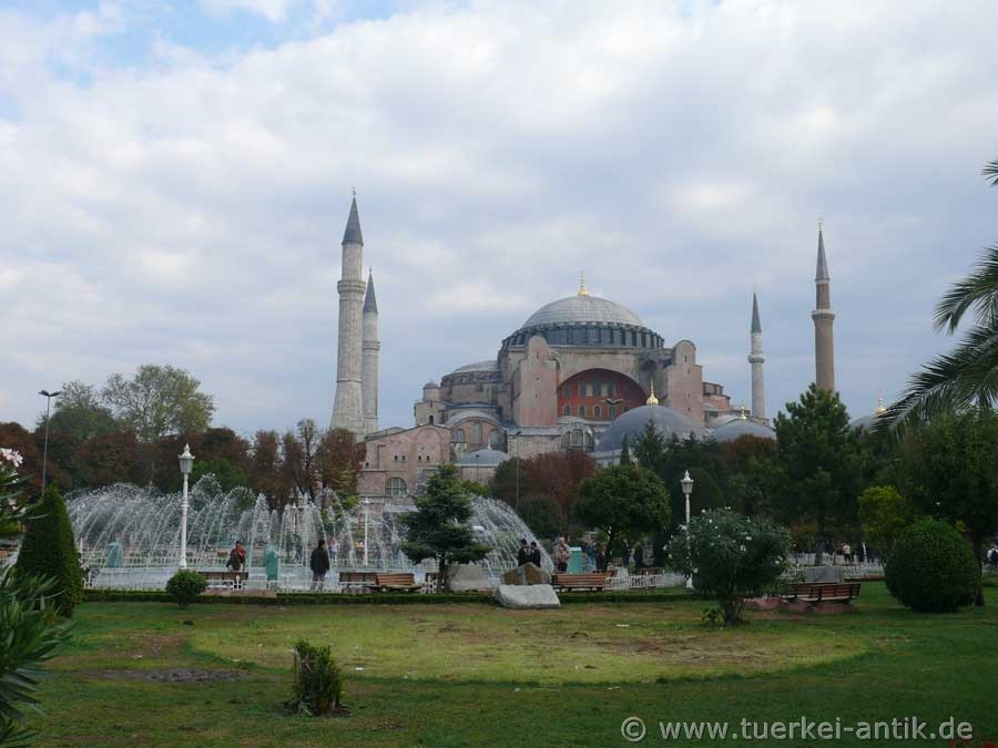 Die Hagia Sophia (türkisch Aya Sofya), Kirche der Heiligen Weisheit ist, ist das wohl bekannteste Bauwerk der Stadt. Die erste Kirche wurde unter Konstantin erbaut, brannte jedoch im Jahre 404 n. Chr. nieder. Der zweite Bau wurde 7 Jahre später vollendet, jedoch 532 n. Ch. während eines Aufstandes völlig zerstört.