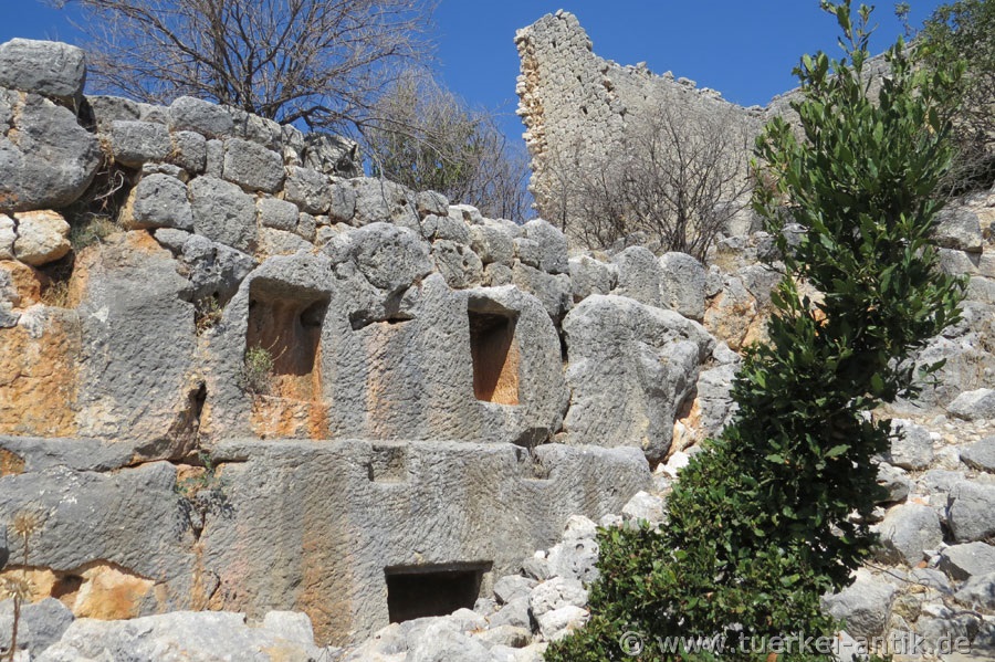 Um die Südwestspitze des Hügels sowie an der Nordwestseite liegen noch die Ruinen von zahlreichen nicht mehr definierbaren Gebäuden, zum Teil in Polygonalmauerwerk gebaut und demnach wohl zeitgleich mit dem Turm. Unterhalb des herrschaftlichen Wohnhauses sind Nischen in den Felsen eingelassen. Es handelt sich vermutlich um Gräber. |