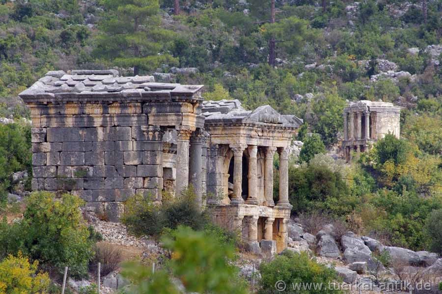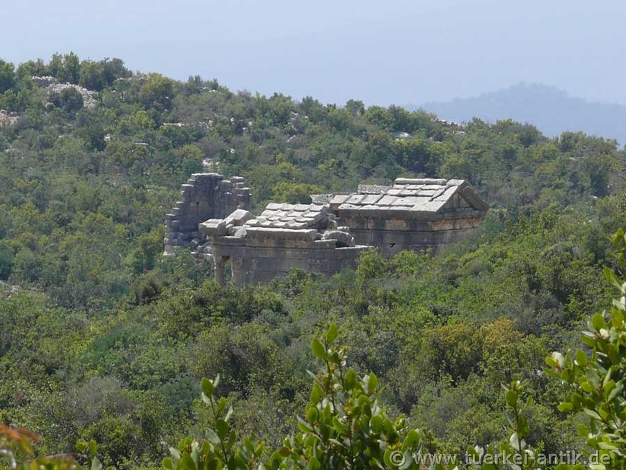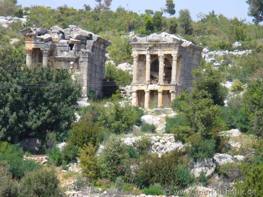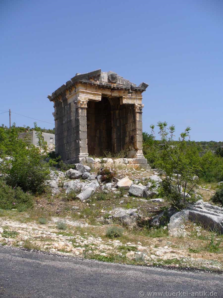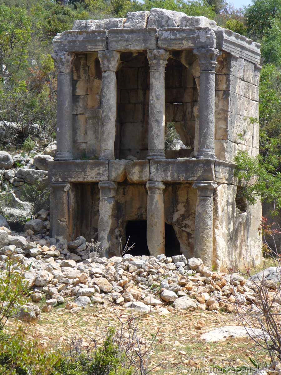 Auf die Straße nach Silifke zurückgekehrt, trifft man an der scharfen Kurve nach dem Ort auf das "untere" Tempelgrab. Es ist nach Süden ausgerichtet und misst 5,3 x 4,25 m und ist 6,25 m hoch. Das Grab ist ebenfalls in die Gründerzeit des Ortes zu datieren. |