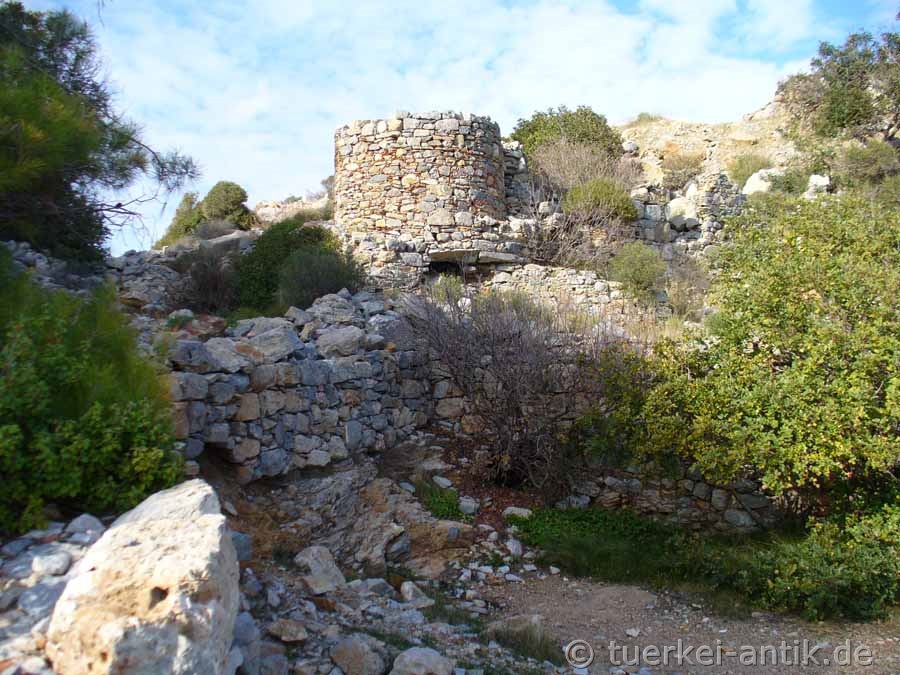 Auf der Landseite bewacht der Hofhund des dort ansässigen Bauern das Gelände. Hier finden sich neben einer byzantinischen Kirchenruine etliche Überreste undefinierter Häuser sowie die Nekopole. Viele derr Gräber fielen der landwirtschaftlichen Nutzung des Geländes zum Opfer, einige teils größere überwölbte Grabhäuser blieben aber erhalten. |