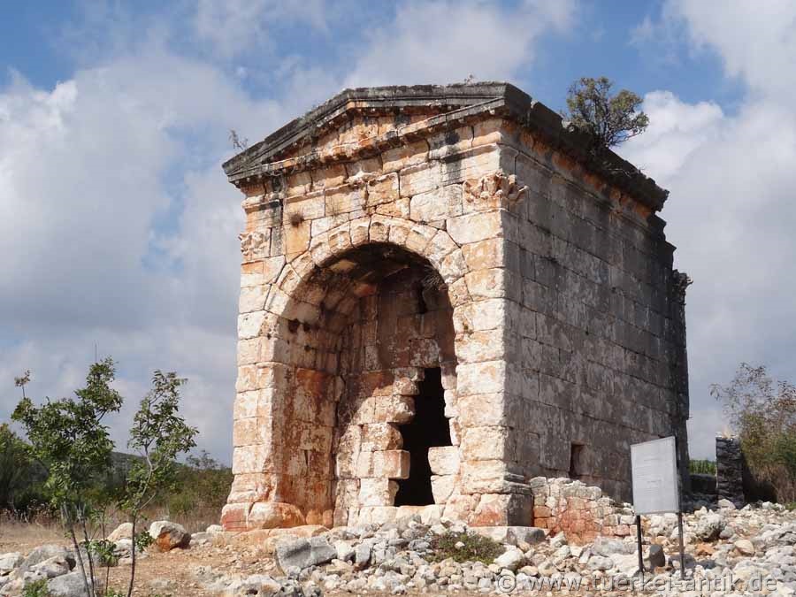 120 m oberhalb der Basilika IV befindet sich das sogenannte, 4,1 x 5,7 Meter große Dreisäulengrab aus dem dritten und vierten Jahrhundert n. Chr. Seine Besonderheit besteht darin, dass es mit drei statt der üblichen vier Säulen ausgestattet ist. Die schmucklose Grabkammer ist völlig leer. |