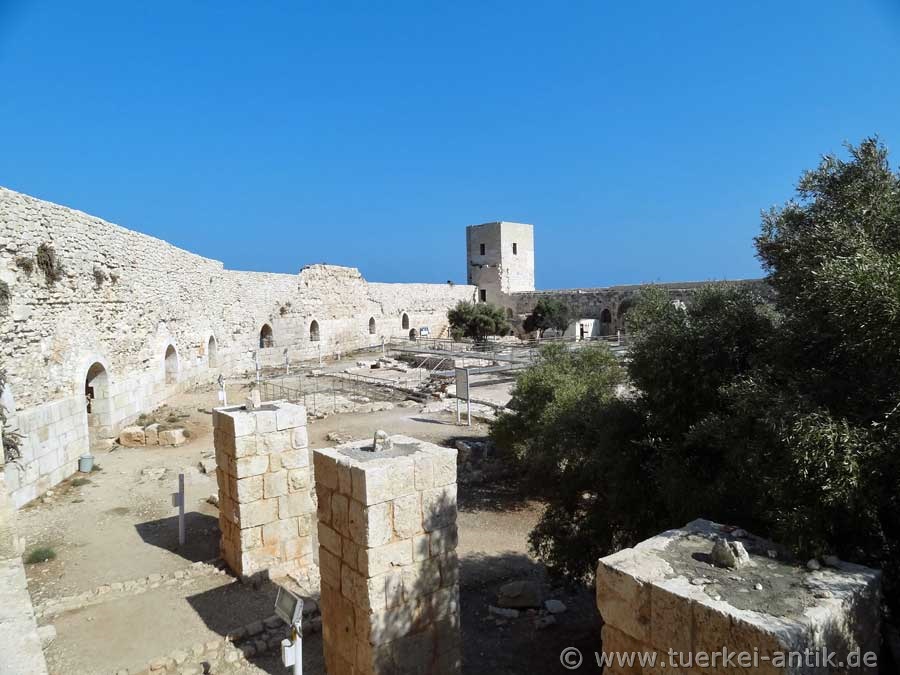 Bekannter, sicher auch weil von weit her sichtbar, ist die Seeburg, die "Mädchenburg", nach der der heutige Ort seinen Namen bekam. (Kizkalesi = türkisch Mädchenburg) Auch diese Burg diente dem Schutz des Hafens. Eine Mole verband einmal beide Burgen. Um ihre Entstehungsgeschichte rangt sich die Sage, dass ein Sultan die Burg errichten lies um seine Tochter vor einem ihr prophezeiten Schlangebiss zu schützen. Der tödliche Biss ereilte die Tochter aber trotzdem, da die Schlange in einem Obstkorb auf die Insel gebracht wurde. Diese Sage hört man in der Türkei allerdings öfter, so auch um dem Mädchenturm im Bosporus bei Istanbul. |