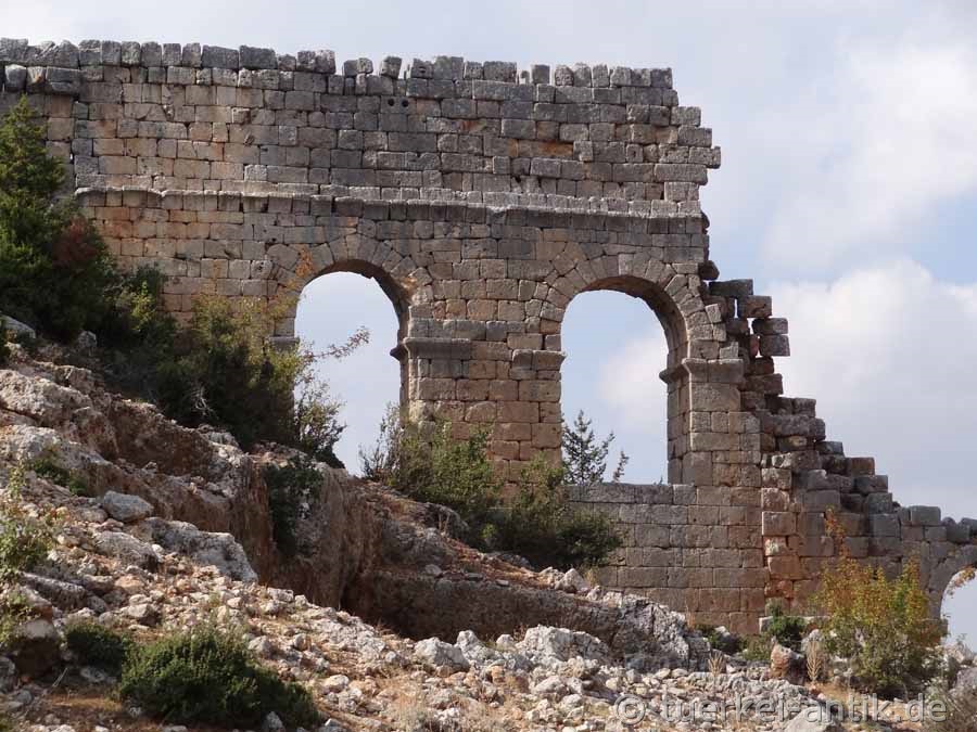 Die hellenistische Stadt lag auf dem Hügel und war von einer heute noch teilweise erhaltenen Stadtmauer umgeben. Die Akropolis wurde auf einem 1112 m hohen Hügel mit dreieckiger Grundfläche erbaut. Die Hänge und die Kuppe des Hügels sind mit antiken Bebauungsresten und Zisternen übersät. An der alten Kreuzung der Straßen nach Diokaisareia, Korykos und Seleukeia sind heute die Reste des Nymphäums zu sehen. |