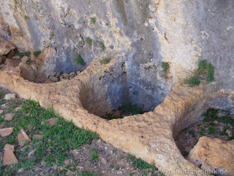 100 Meter ins Tal hinein befindet sich an der nördlichen Seite ein Felsengrab mit Tempelrelief. Im Felsen um die Grabkammer ist die Fassade eines Tempels mit Gebälk, Säulen und Altar im Relief abgebildet. Die heute noch erhaltenen Grundrisse zeigen, dass die antiken Häuser an den Nordhängen erbaut wurden. |