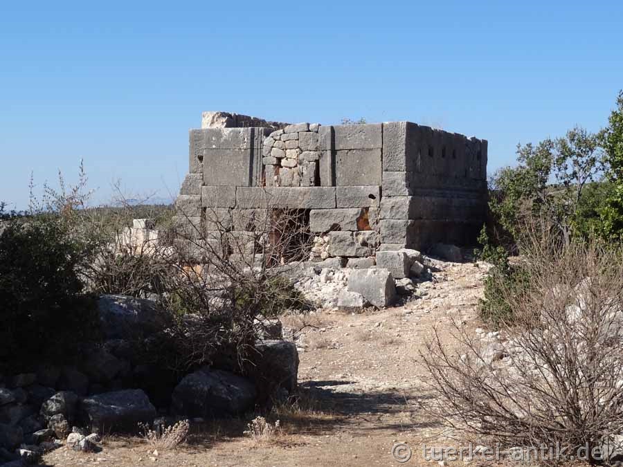 Die jüngsten Häuser sind in Polygonalmauerwerk und Großquadern gemauert und stammen aus der römischen Kaiserzeit. Das für die frühbyzantinische Zeit typische Kleinquaderwerk taucht nicht auf, auch wenn auf einigen Türstürzen Kreuze zu sehen sind. |