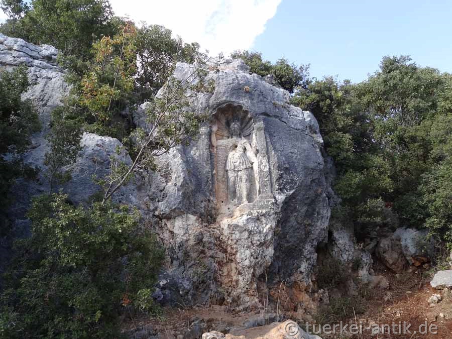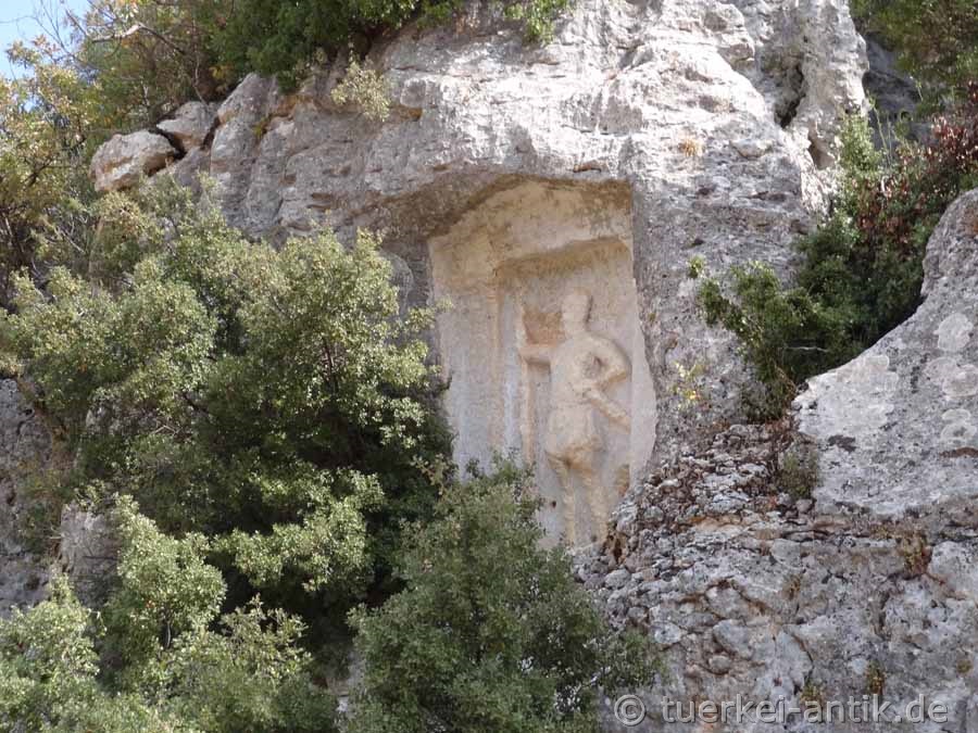 Etwa 600 Meter nordwestlich vom Athena-Relief liegt das Kriegerrelief von Efrenk in einer Felswand neben einem steilen Weg, der zum Fluss Lamos führt. Das Relief ist etwa fünf Meter über dem Straßenniveau in die senkrechte Felswand gearbeitet. Es hat eine Höhe von 1,90 Metern. Es zeigt frontal einen stehenden Krieger, der von einem Naiskos umrahmt ist. |