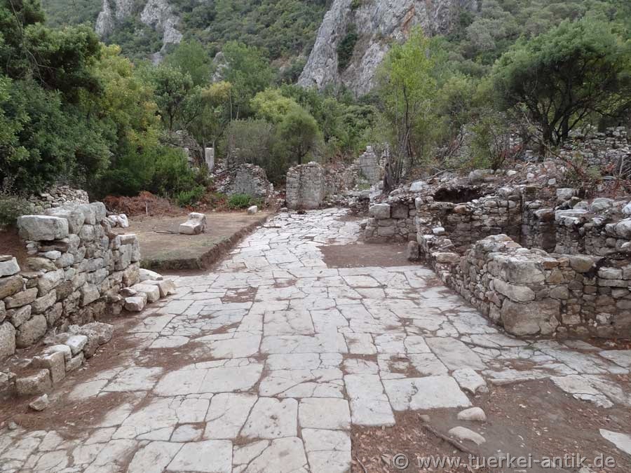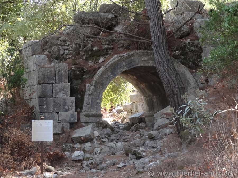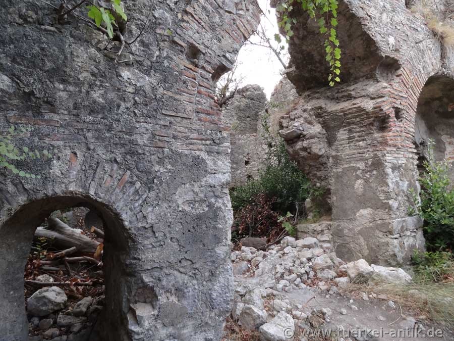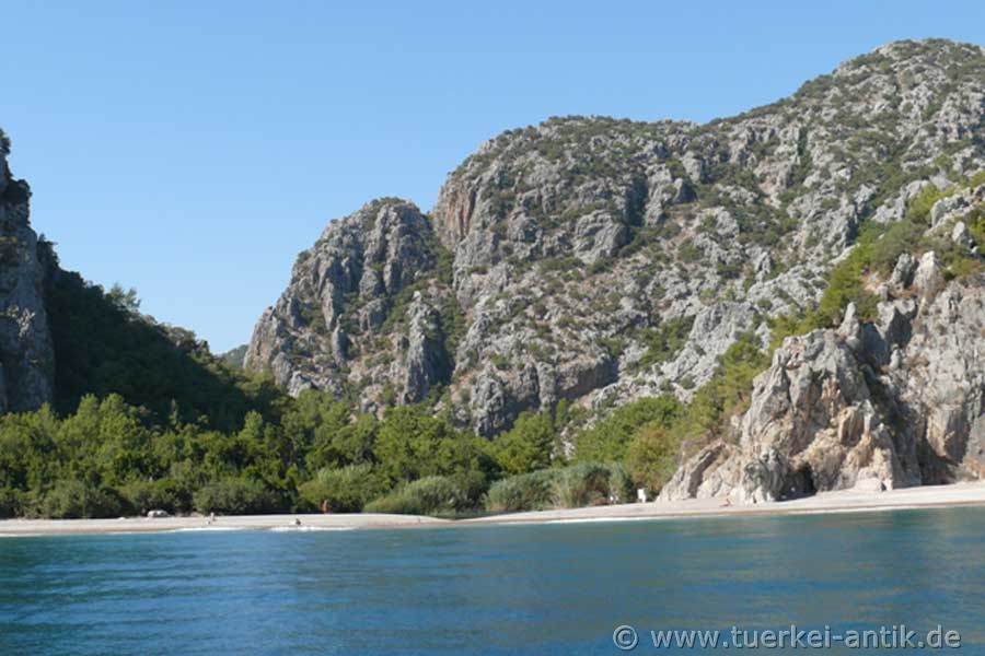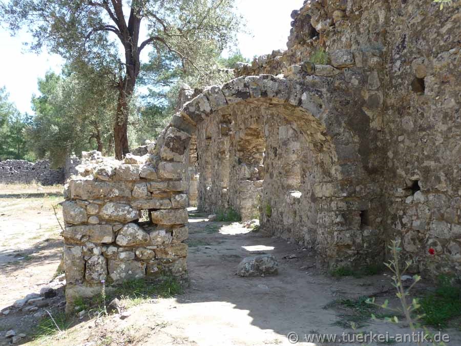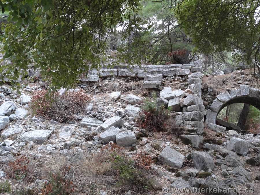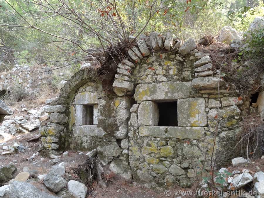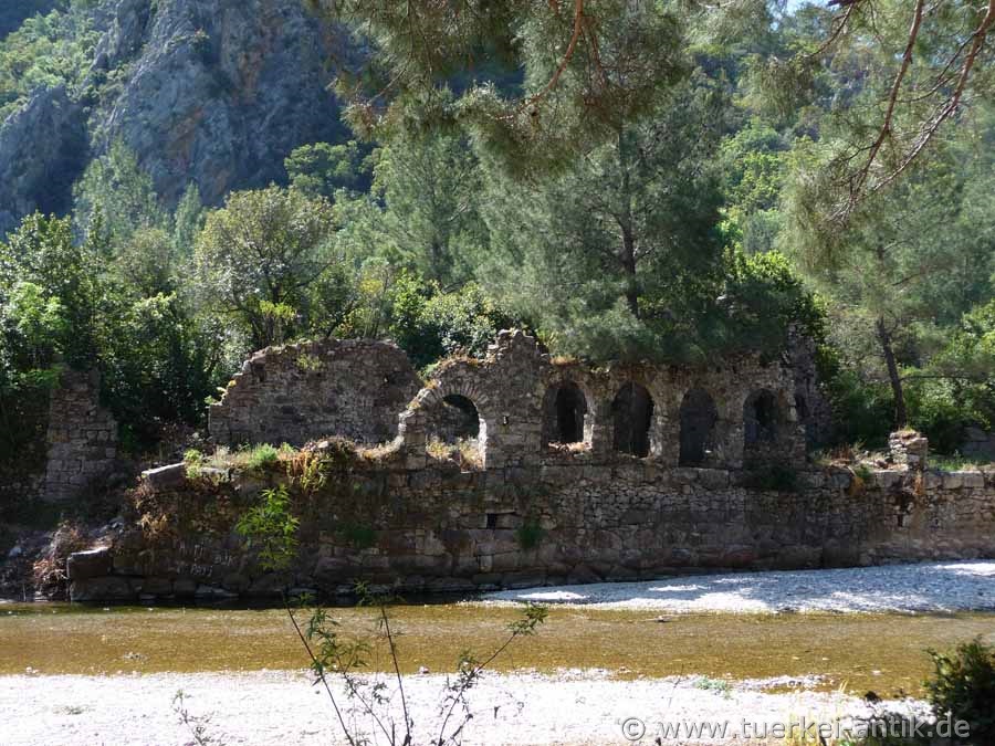 Lange Zeit war Olympos völlig vergessen. Die Stadt war durch einen Bachlauf in zwei Hälften geteilt. Die Reste einer Brücke sind noch auszumachen. Leider sind die noch bestehenden Bauten, wie z.B. ein kleines römisches Theater, die Reste eines Tempels aus dem 2. Jh. v. Chr. sowie eine Basilika aus byzantinischer Zeit stark verfallen und weitgehend überwuchert. Unübersehbar ist die Nekropole mit zahlreichen Gräbern, die jedoch nicht alle lykischen Ursprungs sind. |