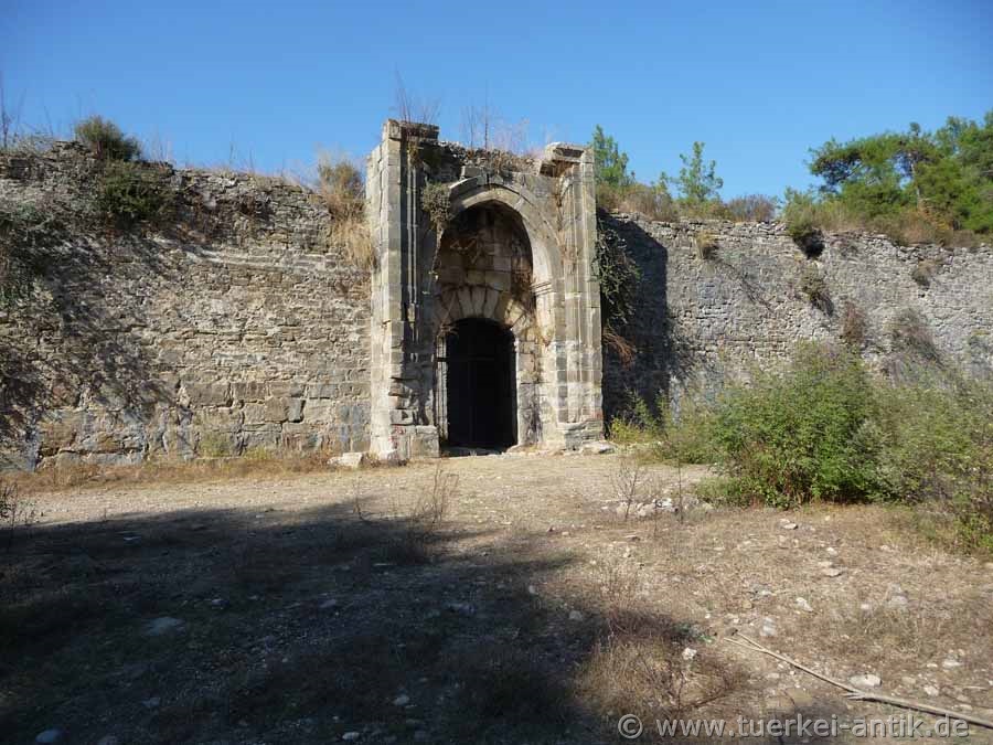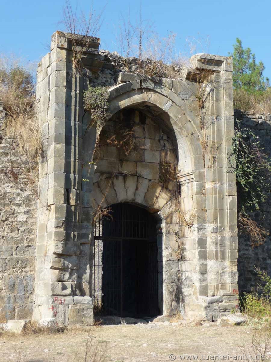 Das Eingangsportal auf der Südseite ist einfach gehalten und lässt die aufwendigen Steinmetzarbeiten zahlreicher anderer Karawansereien vermissen. Es lässt sich am ehesten mit dem Portal der Kirkgöz Han vergleichen.