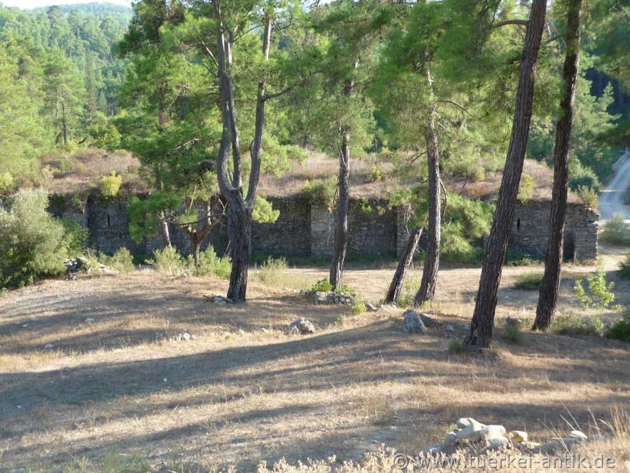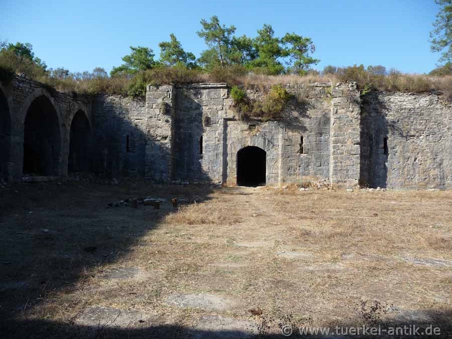 Der Han wird vom Kargi Cay mit Wasser versorgt. Rechts neben dem Eingang befindet sich die Ruine eines 6 x 10 Meter großen Badehauses. Noch heute ist die typische Unterteilung in Caldarium (Heißbaderaum), Tepidarium (Raum mit milder Hitze) und Heizraum auszumachen.