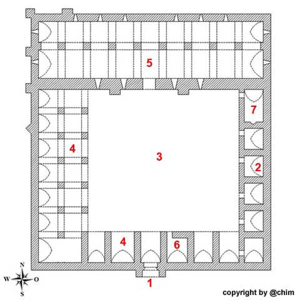 Die Nordseite der Han nimmt eine massive, geschlossene Halle ein. Die Ostseite ist mit geschlossenen Zellen versehen, deren hinterste Zelle anhand der Gebetsnische als Moschee identifiziert werden kann. West- und Südseite sind mit offenen Zellen versehen. Die geschlossene Zelle neben dem Eingangsportal diente als Wohnung des Wächters.
