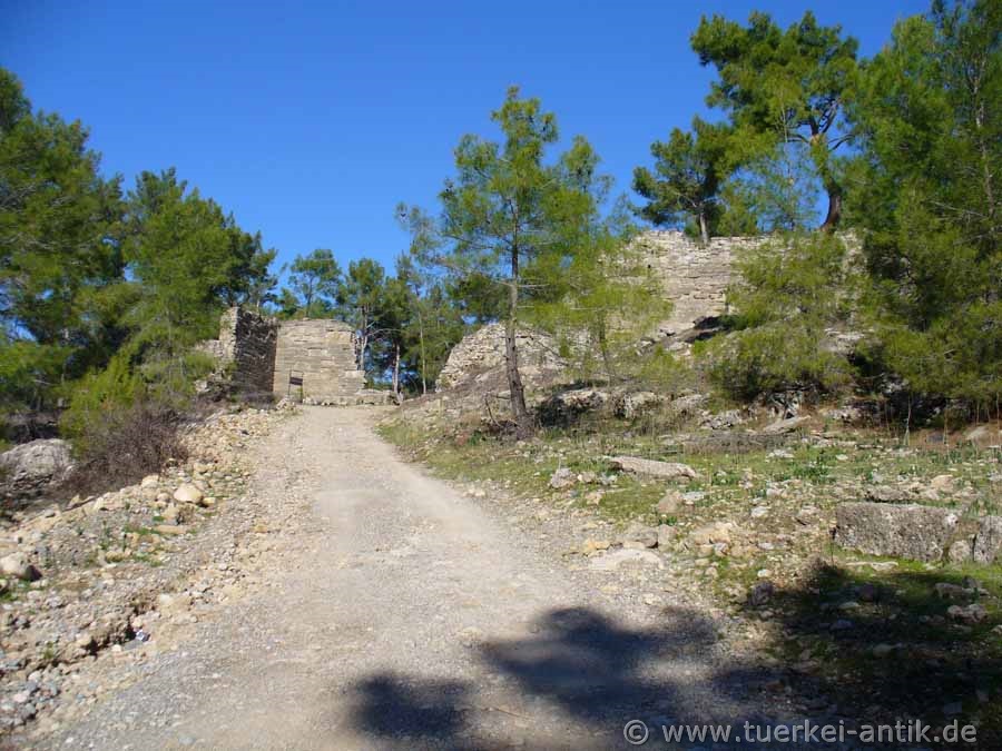 Um nach Lyrbe (Seleukia) zu kommen, fahren Sie in Manavgat am künstlichen Wasserfall nicht in den Ortskern hinein, sondern biegen Sie, von Side kommend, links ab. Ausgeschildert mit braunem Schild | Şelale 4 / Seleukele 13 | Folgen Sie dieser Straße. Sie führt am kleinen und großen Wasserfall (Şelale) vorbei. Kurz hinter Manavgat sind auf der linken Seite eine alte, römische Brücke und ca. 2 km weiter die Reste eines Aquäduktes zu besichtigen. Über diesen Aquädukt wurde das alte Side mit Trinkwasser aus dem Taurusgebirge versorgt. Wenige Kilometer nach dem großen Wasserfall führt eine ausgeschilderte Straße links ab nach Lyrbe (Seleukia). Nach ca. 1 km erreichen Sie das Dorf Bucakşeyhler. Im Dorf halten Sie sich rechts, an der Moschee ebenfalls rechts. Die früher unbefestigte, nach Regenfällen kaum befahrbare Straße zu den Ruinen ist heute bis zum Parkplatz unterhalb des Stadttoren geteert. Die Stadt liegt auf einem heute bewaldeten Hügel, von drei Seiten durch steil abfallende Hänge geschützt. |