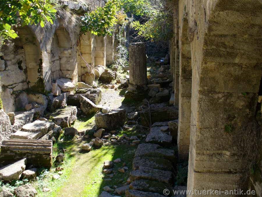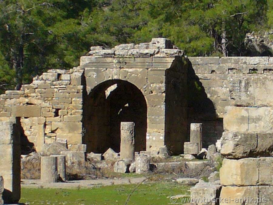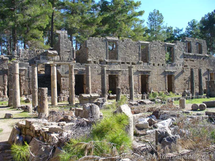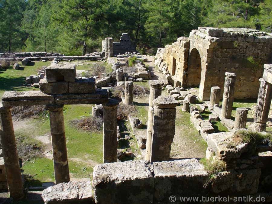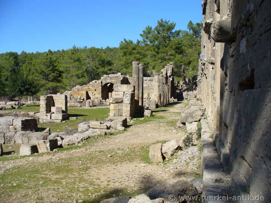 Lyrbe (Seleukia) ist ausgestattet mit der besterhaltenen Agora (Marktplatz) Kleinasiens. Die Stadt liegt, schwer zugänglich und verschont von neuzeitlicher Besiedlung, rund 23 km nördlich von Side inmitten eines dichten Pinienwaldes. Neuere Forschungen deuten darauf hin, dass es sich bei den Ruinen um eine Stadt namens Lyrbe handelt, und nicht wie lange vermutet, um das Seleukia in Pamphylien. |