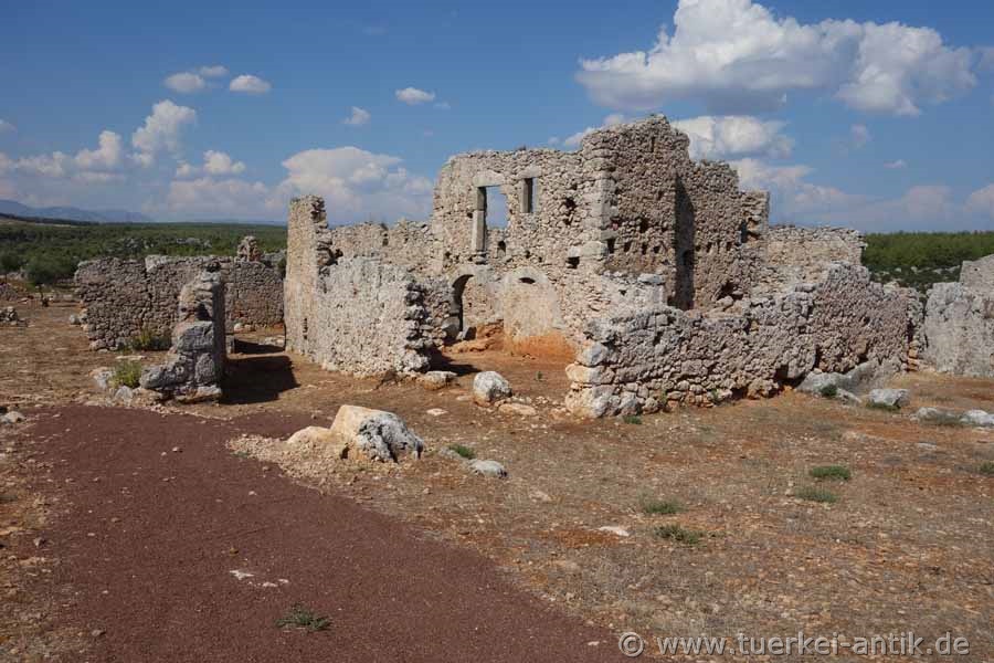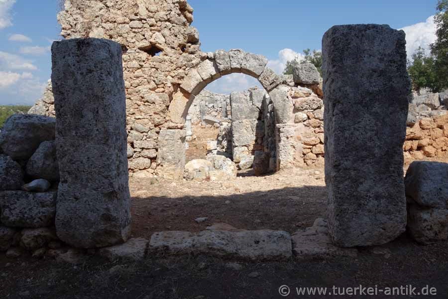 Die Inschrift auf dem Turm -heute wird er als Arete-Kulesi bezeichnet- sagt aus, dass die Besitzer und Herren des Dorfes und der Olivenhaine in der Römerzeit die Brüder Demetrios und Apollonios waren. Demetrios Tochter und Demelers Priesterin Arete ließen den Turm auf eigene Kosten neu errichten, um ein Versprechen an das Dorf zu erfüllen. Sie ließ es überdachen und widmete es dem Kaiser Caesar Domitian Augustus Germanikus und der Artemis von Perge. Die ursprüngliche Errichtung des Gebäudes stammt aus der Zeit von Domitian (81-96 n. Chr.); eine Dachreparatur erfolgte zu Hadrians Zeiten (117-138 n. Chr.).