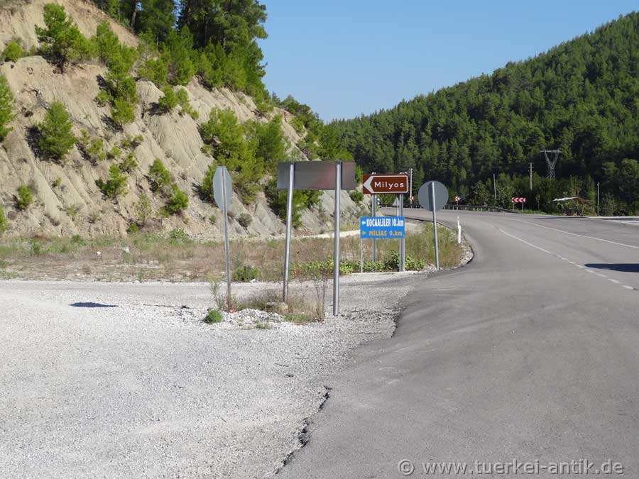 Sie erreichen Milyos über die Nationalstraße D685 von Antalya nach Isparta. Knapp 50 km nach dem Abzweig der D685 von der Küstenstraße D400 nahe dem Flughafen Antalya erreichen Sie am nördlichen Ende des Karacaören Stausees linker Hand den deutlich ausgeschilderten Abzweig nach Milyas / Kocaaliler. Die
