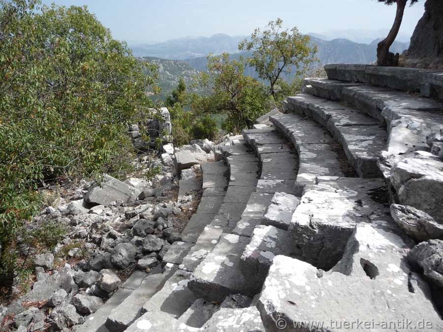 Die oberen Sitzreihen des Theaters sind teilweise in den Fels gehauen, teilweise in den natürlichen Hang gebaut. Die zur Agora gewandte Seite des Bühnenhauses ist recht gut erhalten. |