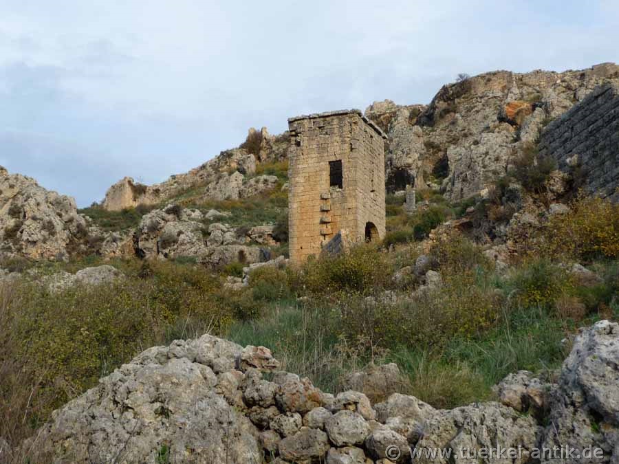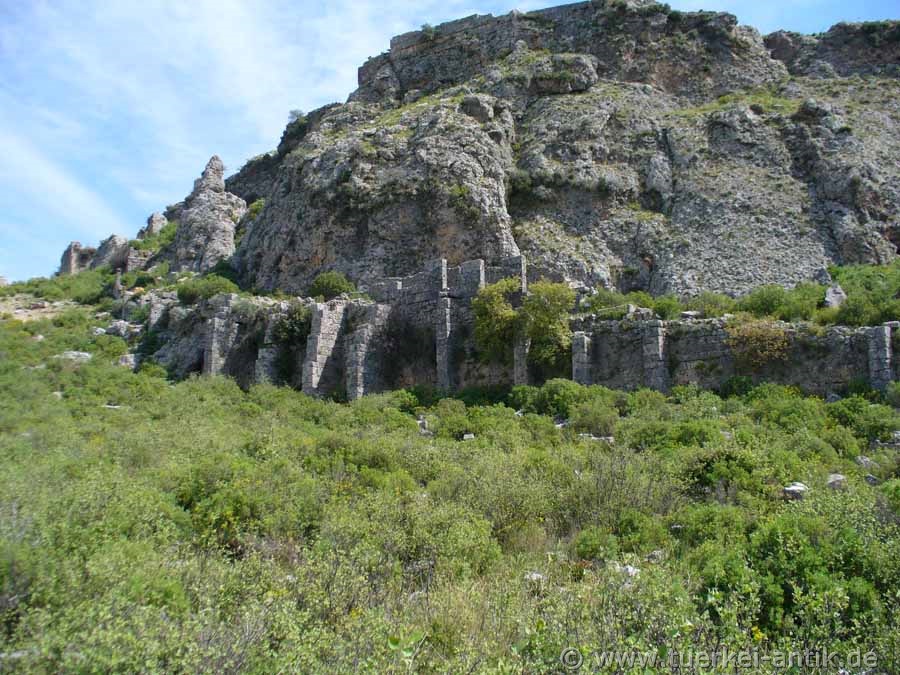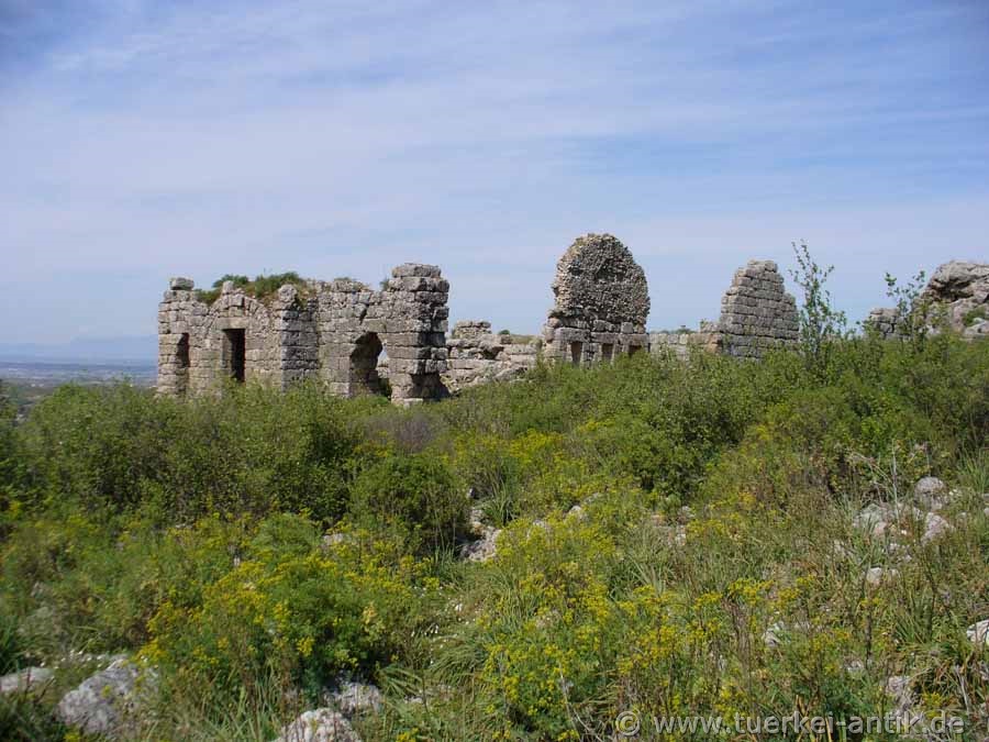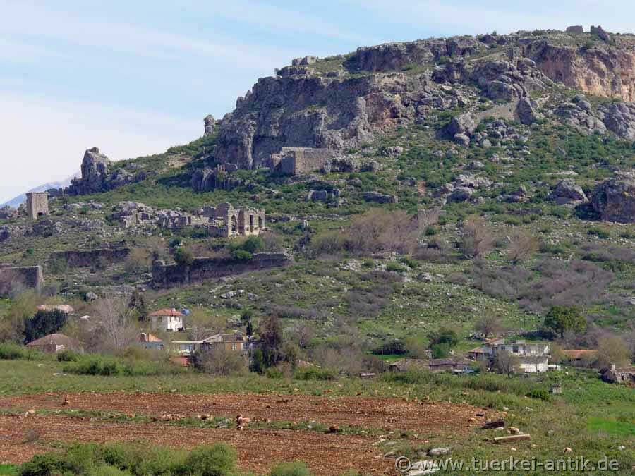 Auf dem Südwestteil des Plateaus liegt der Kern der Stadt. Erhalten sind ein byzantinisches Großgebäude in voller Höhe sowie ein hellenistisches Gebäude, wohl ein Gymnasion von 6 Meter Höhe, mit zehn Fenstern in unterschiedlicher Größe. Ein weiteres, kleineres hellenistisches Gebäude verfügt an einem Türpfosten über eine Inschrift in pamphylischer Sprache. Weiter östlich sind auf Terrassen Reste von Wohnhäusern und Fundamente von nicht näher bestimmbaren Tempeln zu sehen. Aus seldschukischer Zeit stammt eine kleine Moschee. |
