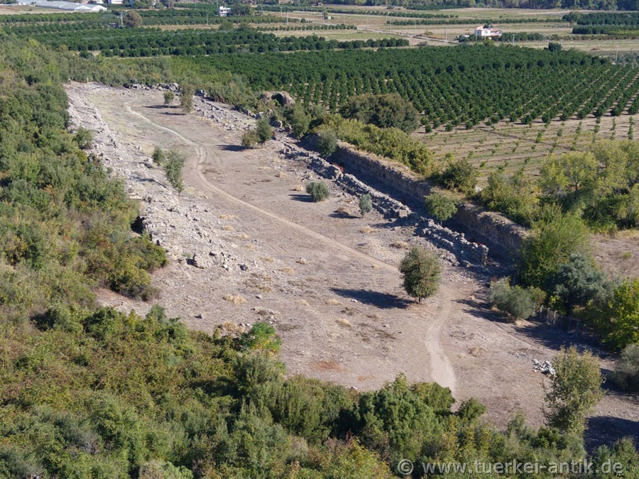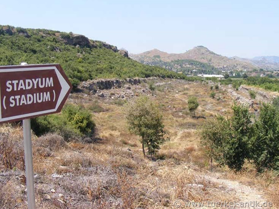Parts of the grandstands and the shops are still visible. The best preserved part can be found on the northwestern side of the hill. The Austrian explorer Karl Graf Lanckoroński wrote already in 1890 in his book "Städte Pamphyliens und Pisidiens" about the stadium of Aspendos: |