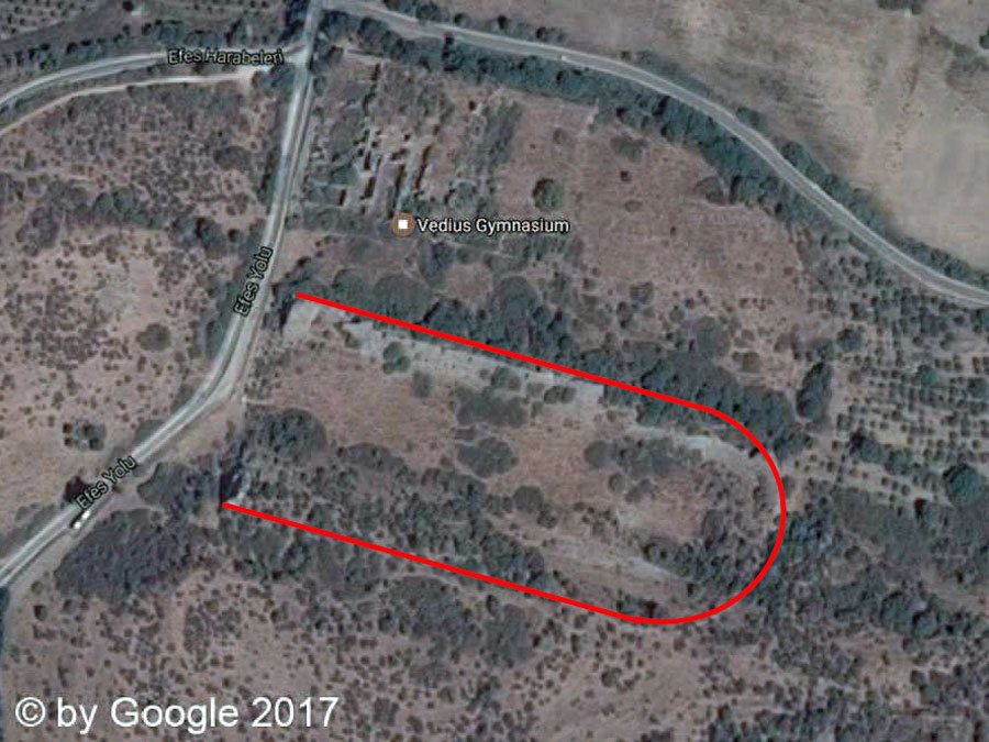 The stadium on the northwest side of Panayir Dag has not been excavated. The archaeological development did not begin until 1993. The actual running surface of the stadium built under Emperor Nero (54-58 AD) was about 180 m long. On the side of the horseshoe-shaped stadium open to the northeast was a monumental gate up to 7 m high with five round arches. The spectator terraces were tunnelled. |