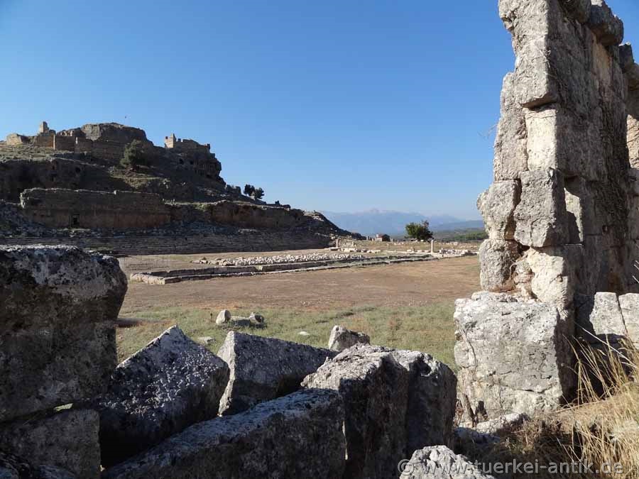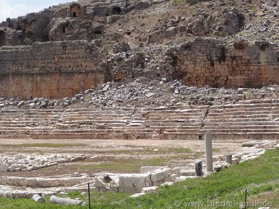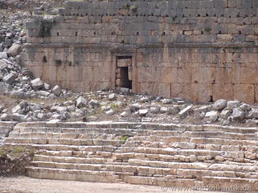 The Tlos Stadium is located at the foot of the Acropolis. According to today's knowledge, it only offered space for about 2,500 spectators. The retaining wall above the spectator terraces was probably fortified during the Roman Empire using spoilers. Today, only the spectator stands can be seen on the mountain side. Whether there is evidence for rows of seats built on substructures in Roman times and later removed was not known. Nor was it possible to determine whether wooden grandstands were used. The 75 metre long and 8 metre wide fortified foundation could indicate this. At least one access led from the mountain side through the retaining wall directly to the spectator stands. |