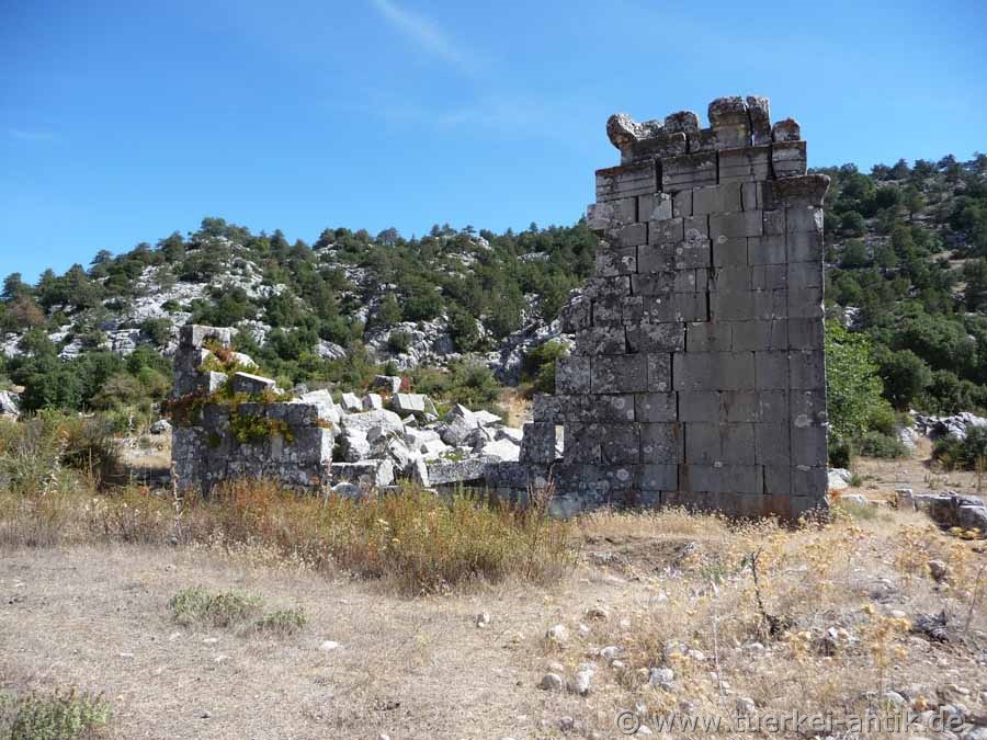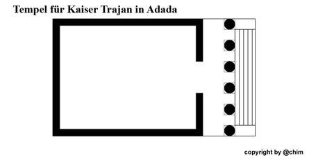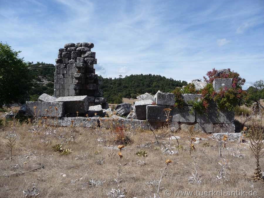 Der ionische Pseudoprostyle Tempel hat sechs Säulen, auf der Vorderseite. Die Wände des Naos sind bis auf eine Wand vollständig eingestürzt. Das monumentale Tempelportal zeigte in Richtung Agora. |