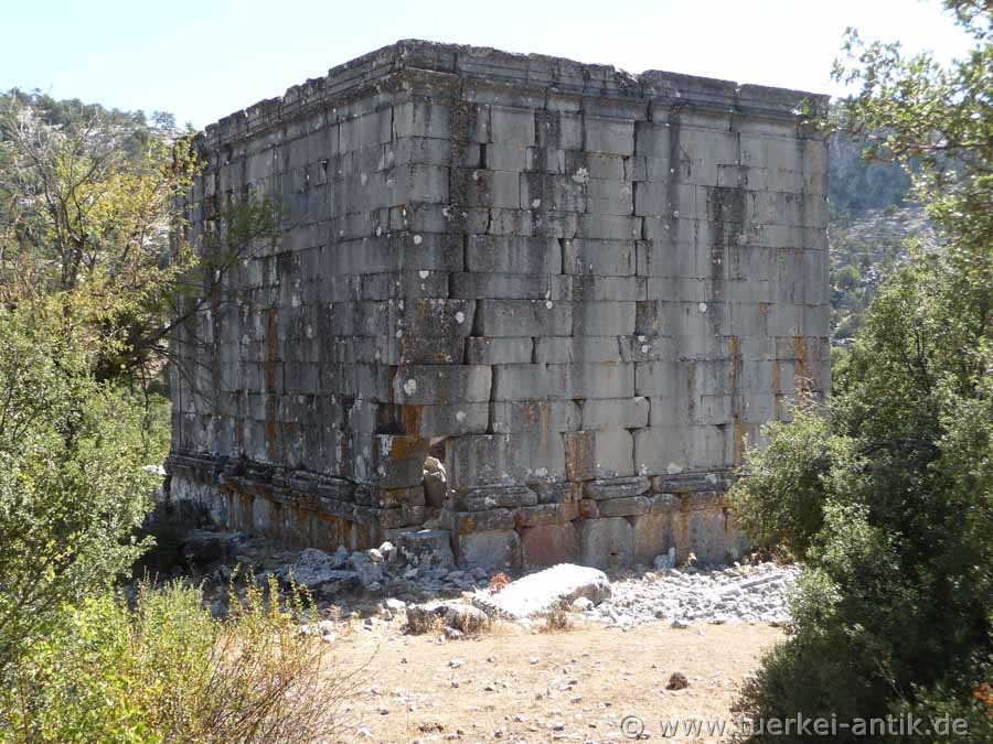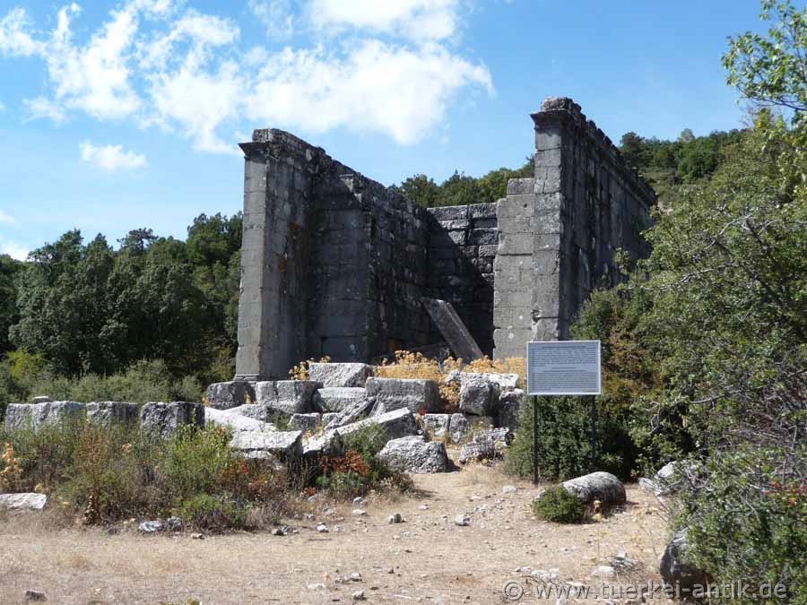 Dieser korinthische Prostyle-Tempel hat vier Säulen auf der Vorderseite. Er wurde durch Erdbeben zerstört. Der Naos ist bis zur Höhe des Gebälks intakt. Die Freitreppe auf das Podium ist beschädigt. Die herabgefallenen Bauteile bleiben in situ. An der Rückseite des Naos befindet sich ein monumentaler Altar. Hier stand die Statue des Kaisers und des Zeus. |