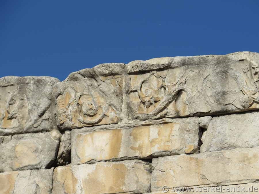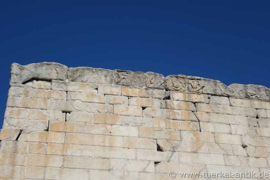 Auf der erhaltenen südöstlichen Innenwand des Pronaos ist die