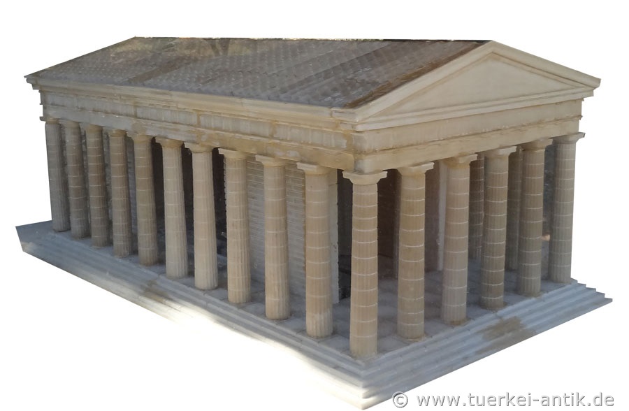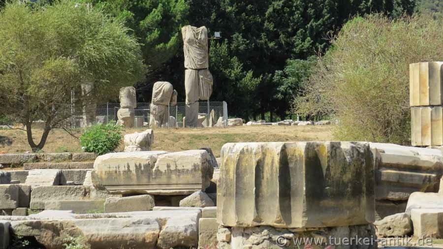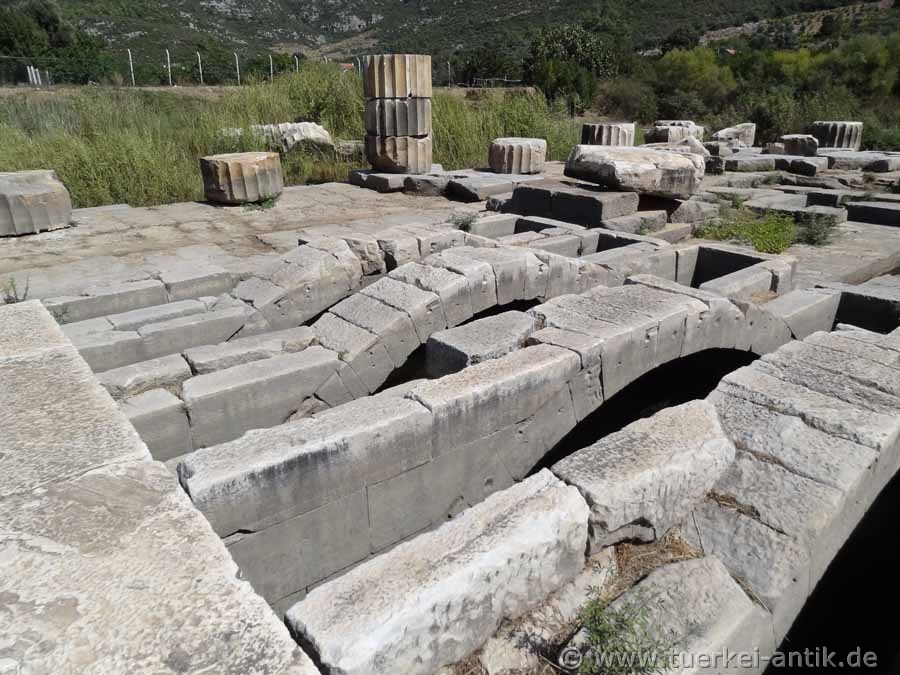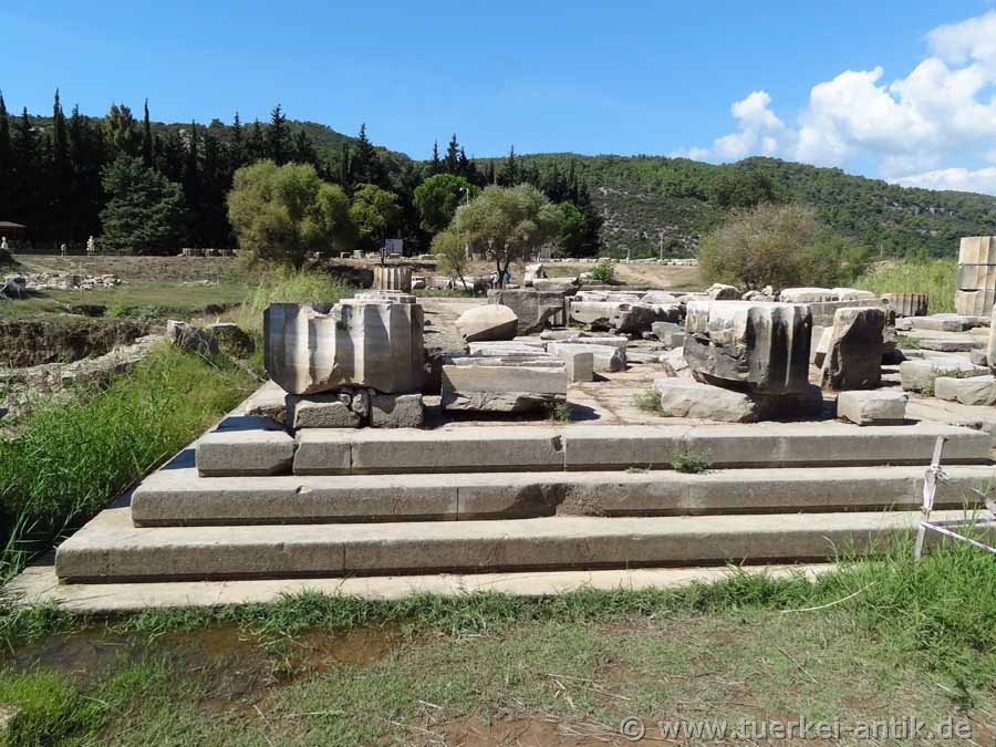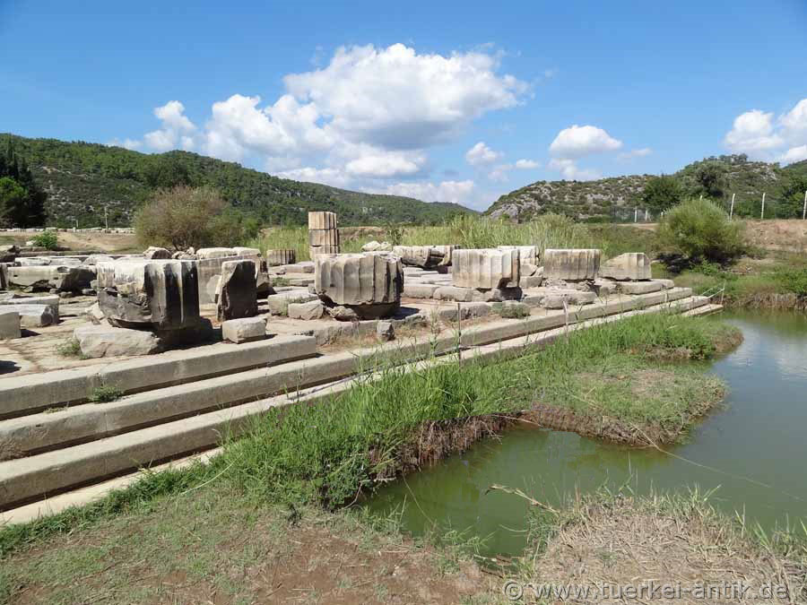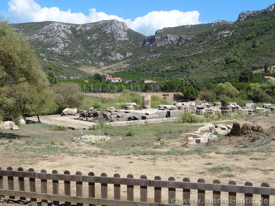 Der Tempel des Apollon ist Teil eines Orakelortes, der bis in die römische Zeit einen mit den großen Orakelorten vergleichbaren Ruf hatte. Überliefert ist, dass in dieser Zeit in seiner Cella die Monumeltalsstatuen eines sitzenden Apollon sowie einer Artemis und einer Leto, beide stehend, aufgestellt waren. Fragmente überlebensgroßer Kultstatuen sind heute an ihrem ursprünglichen Platz vor dem Tempel ausgestellt. |