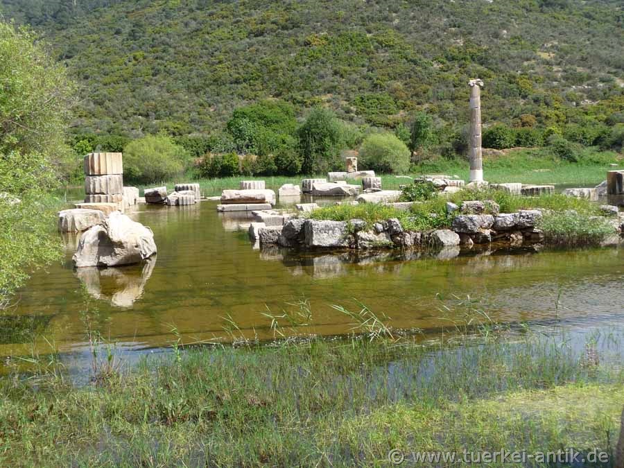 Wenn Sie das Orakelheiligtum Claros besichtigen wollen empfiehlt es sich, es im Herbst aufzusuchen. Im Frühjahr steht das Grundwasser derart hoch, dass der Tempel und das umliegende Gelände bis zu 2 Meter hoch unter Wasser steht. |