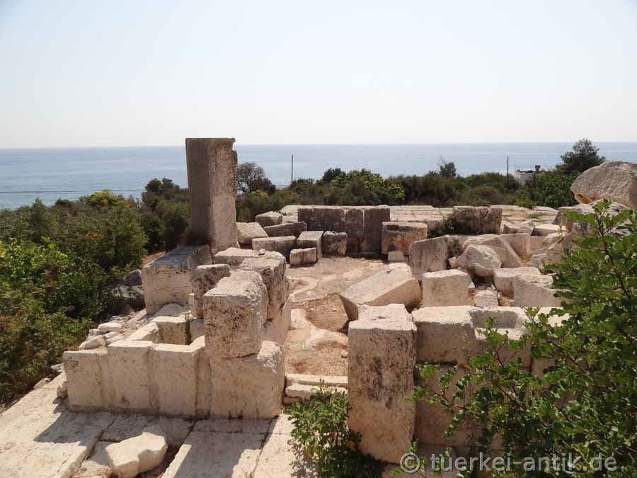 Seine Verwendung als Sakralbau wurde im 4. oder 5. Jh. n. Chr. aufgegeben. Im späten fünften Jahrhundert wurde quer zur Tempelachse eine Kirche eingebaut. Entsprechend der infolge der Verlandung des Hafens gesunkenen Einwohnerzahl der Stadt fiel der Kirchenbau mit 11 x 7 Meter vergleichsweise klein aus. Erbeben, mutwillige Zerstörung wie auch die Verwendung der Baumaterialien für Bauten im nahen Korykos führten zum heutigen Aussehen der Ruine. |