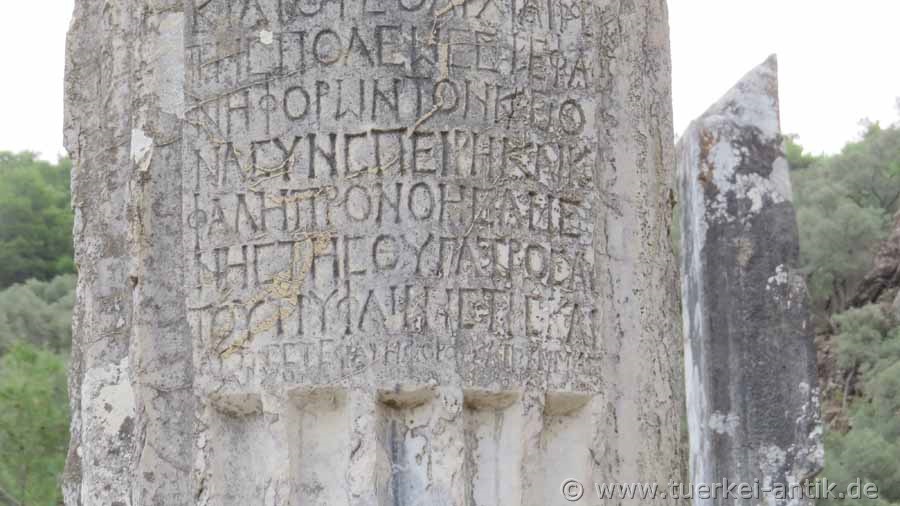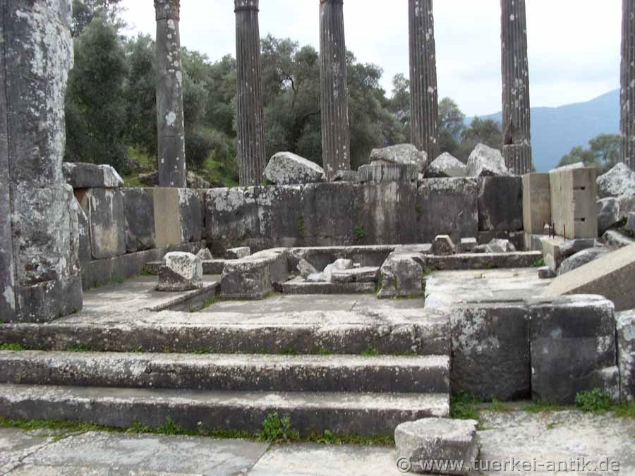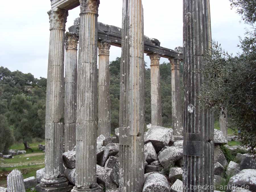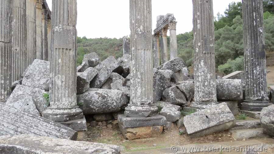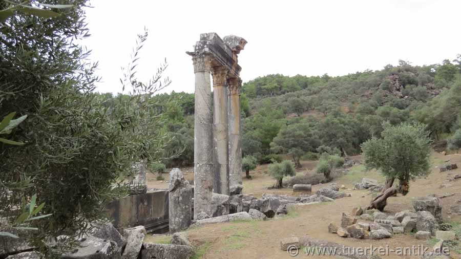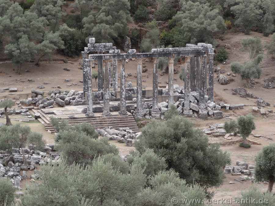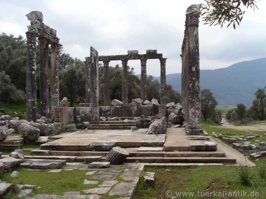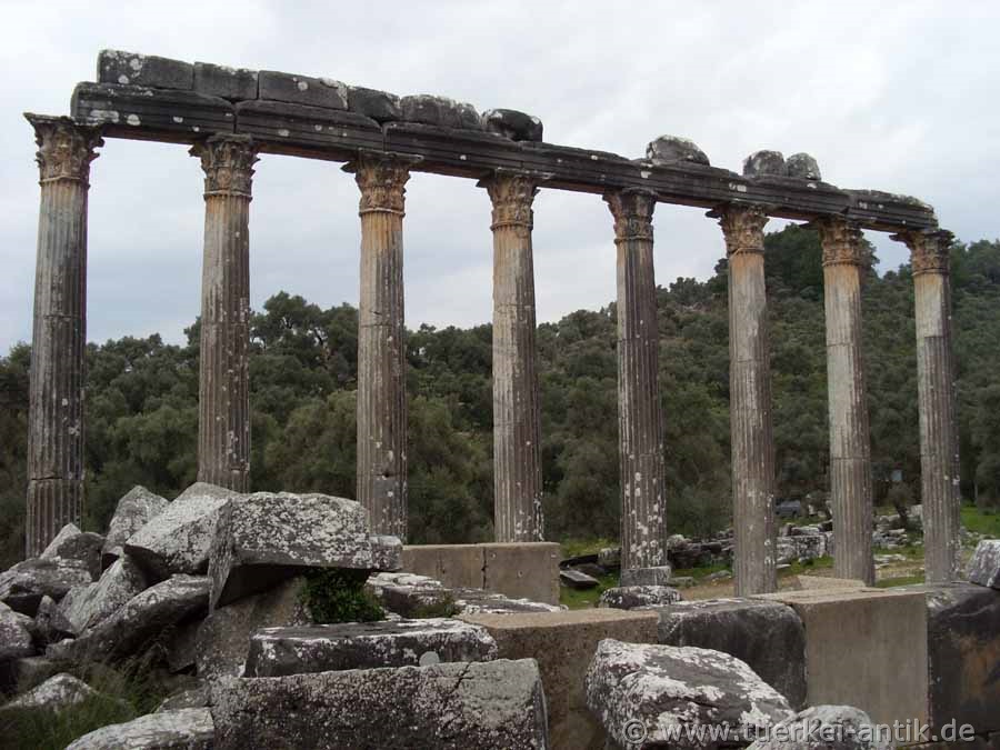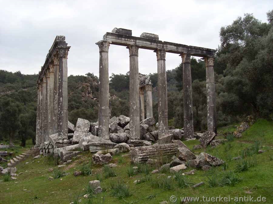 Der Tempel des Zeus Lepsynos gilt als einer der sechs besterhaltenen Tempel der Türkei, obwohl seine Verzierungen anscheinend nicht ganz fertig geworden sind. Von den ursprünglich 32 korinthischen Säulen steht die Hälfte noch aufrecht und trägt Teile des Gebälks. Inschriften erinnern an die Stifter und die Steinmetze aus dem damaligen Zeusheiligtum Labraunda haben mit der Doppelaxt (Labrys) mehrfach ihr Zeichen gesetzt. |