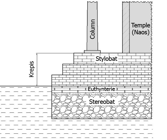 The underground foundation of a Greek temple is called Stereobat, the uppermost layer the Euthynteria. The surface of the euthynteria is carefully smoothed and balanced. On top of this rises a usually three-part stepped building, called Krepis (or Krepidoma), whose uppermost step forms the base for the columns and is therefore called Stylobat. Stereobat, Euthynterie and Krepis together form the foundation of the temple. |