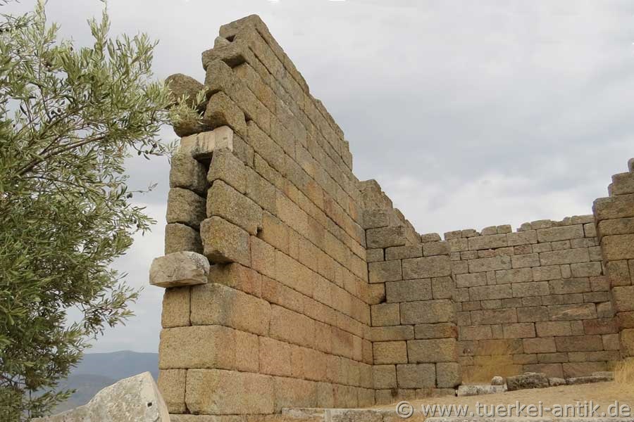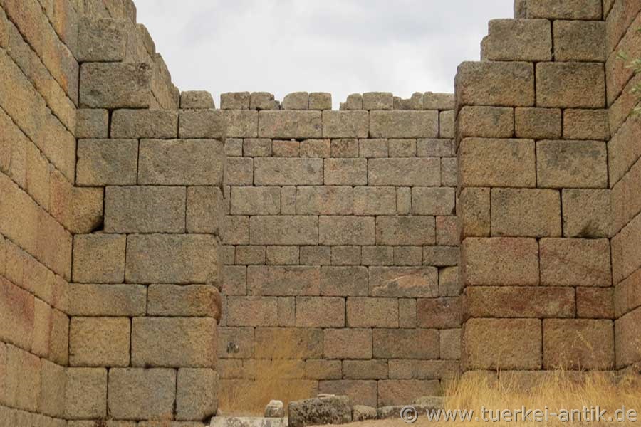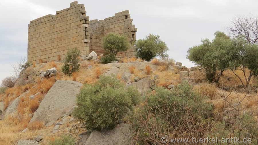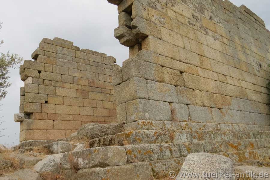 Der Erhaltungszustand dieses Tempels ist erstaunlich gut. Es fehlt eigentlich nur der Pronaos und die zwei Säulen zwischen den Anten, sowie das Dach. Erbaut wurde er um 300 v. Chr. im Zuge der hellenistischen Neugründung der Stadt, 10 Fußminuten vom karischen Latmos entfernt. |