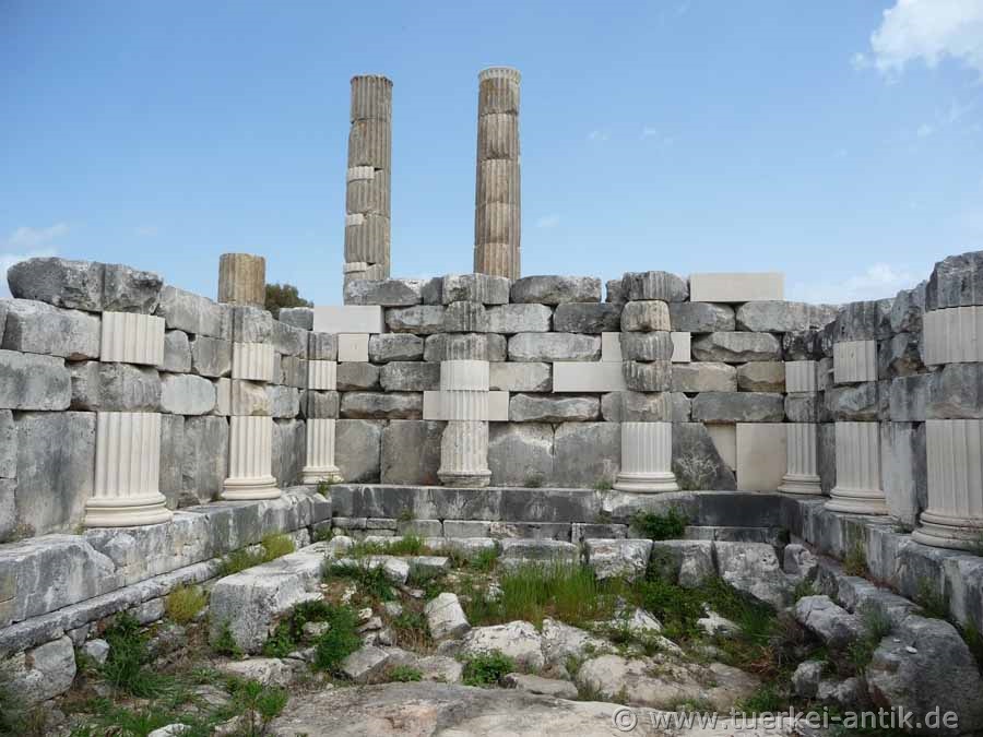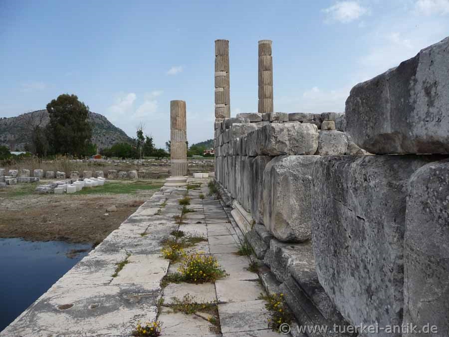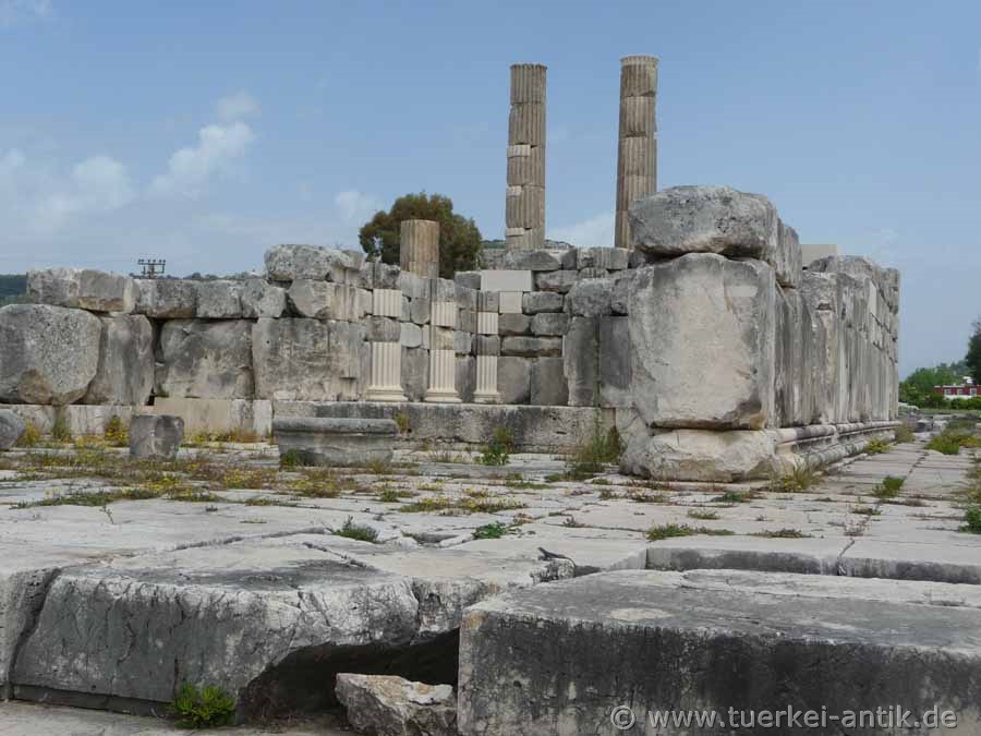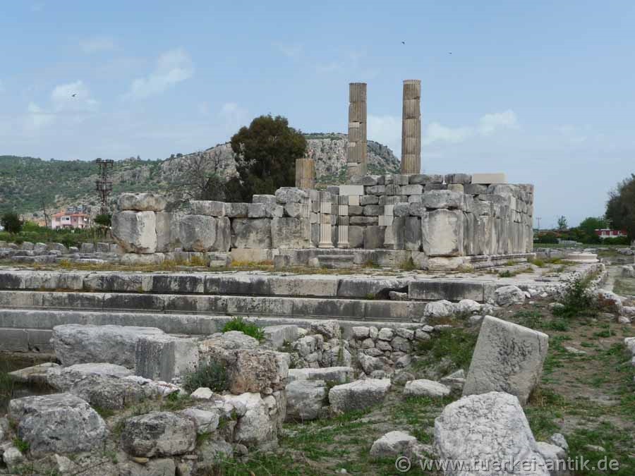 Der Tempel der Leto war der größte der drei Tempel des nach der Göttin genannten Heiligtums. Er ist der am besten Erhaltene. Dadurch dass er, wie auch seine beiden Nachbartempel, auf felsigem Grund errichtet wurde, ist er vom jahreszeitlich steigenden und fallenden Grundwasserspiel geschützt. |