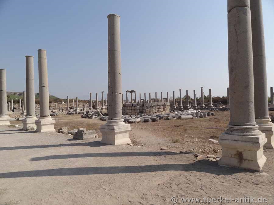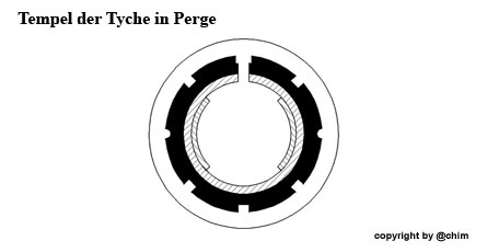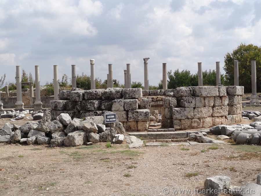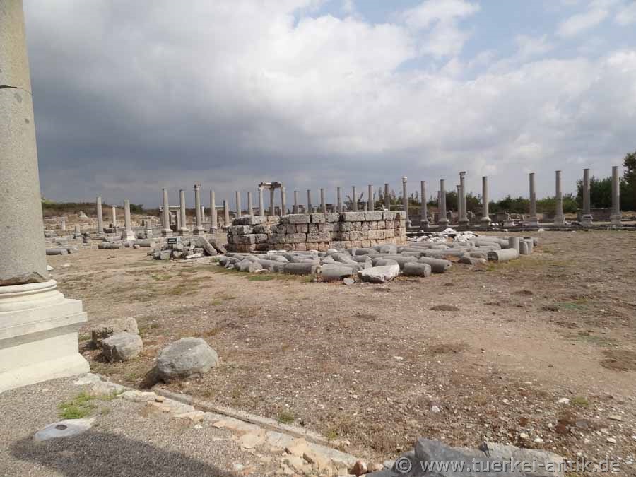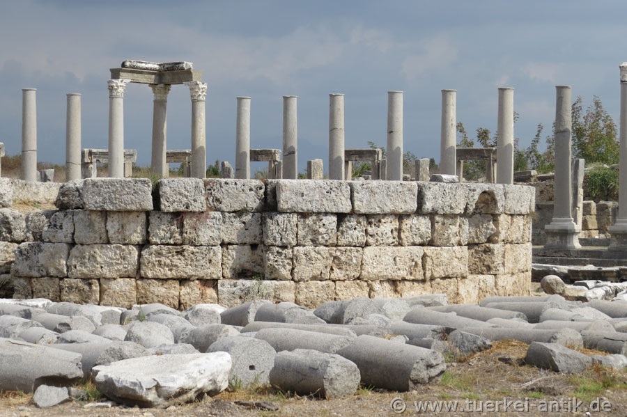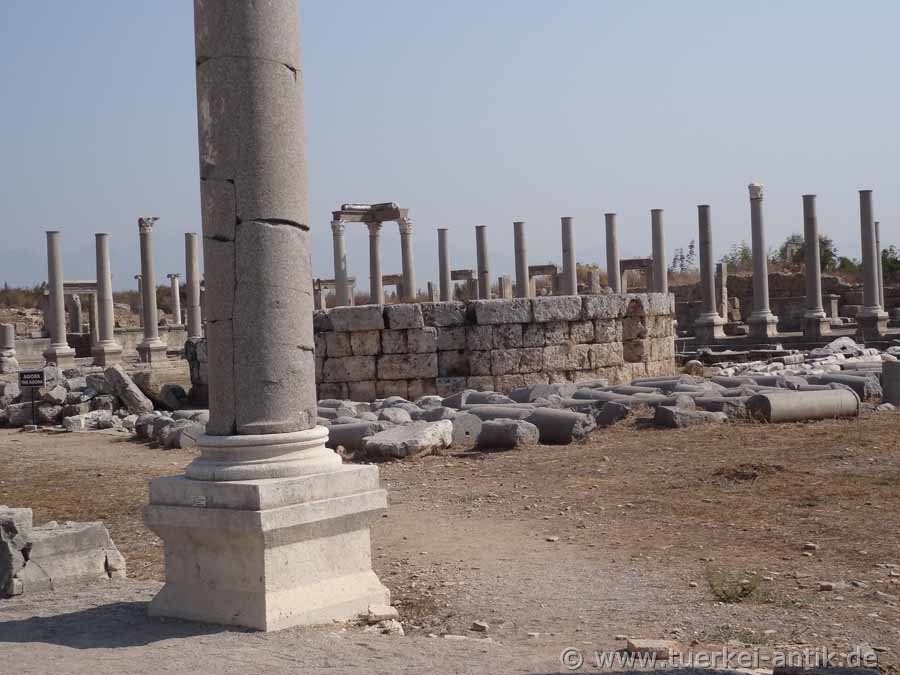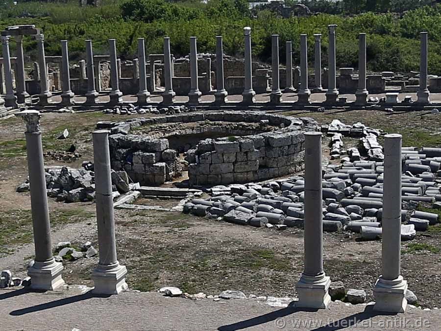 Der Tempel der Tyche befindet sich auf der einst von Säulenhallen eingefassten 76 x 76 Meter messenden Agora. Die Bauart ähnelt dem Tychetempel auf der Handelsagora in Side, weist aber erhebliche Unterschiede auf. So ist z. B. ein ebenerdiger Zugang vorhanden. Es deutet wohl einiges darauf hin, dass zumindest das Untergeschoss als Brunnen ausgebildet war. |