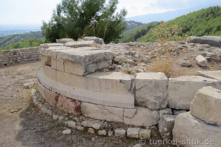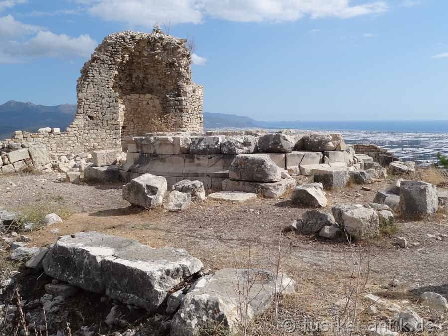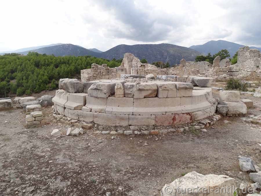 Der Tempel der Tyche befindet sich am südlichen Ende der Agora. In den letzten Jahren konnten etliche Bauteile der alten Bausubstanz sichergestellt und wieder an ihrem ursprünglichen Platz eingesetzt werden. |