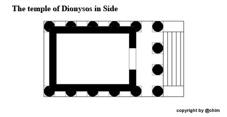 The temple of Dionysus is located directly in front of the theatre, directly behind the former great triumphal arch, which today represents the entrance to the old town of Side. The temple was built on a high pedestal and consisted of a 2.5 meter deep pronaos (porch) and the cella, the sanctum of the temple. Four columns of red granite with Corinthian capitals with richly decorated cornices adorned the vestibule. Remnants of this were preserved, although it is not certain whether they came from a later reconstruction of the temple or whether they were taken over from the original construction of the temple. |