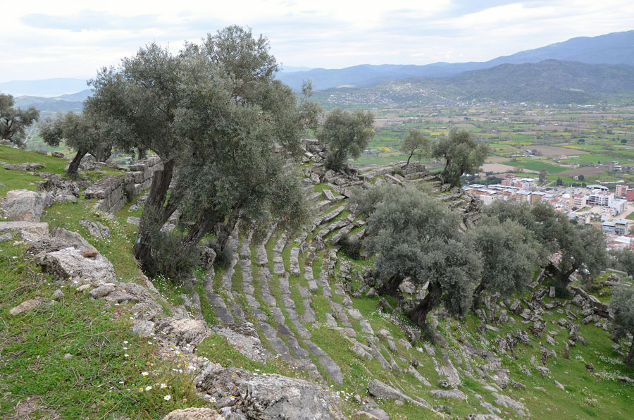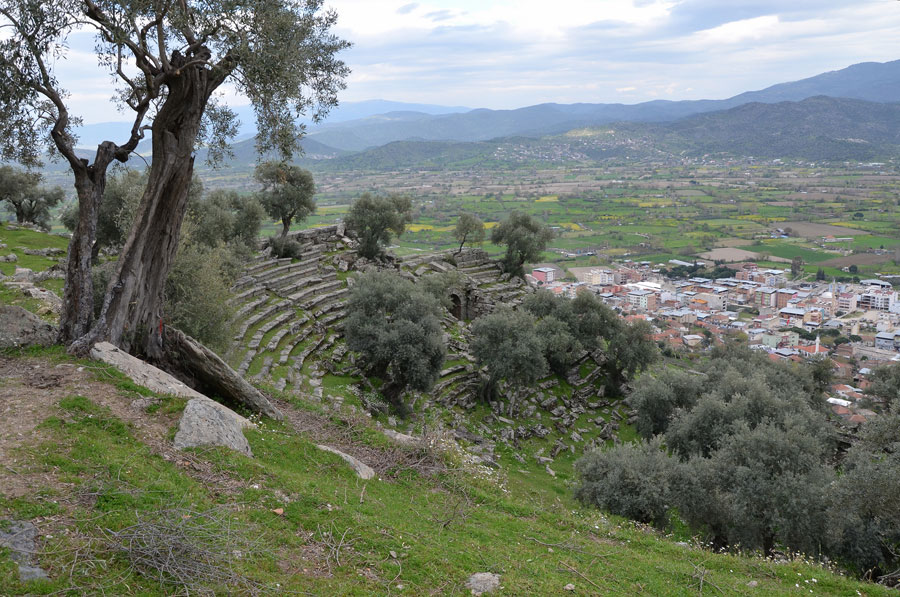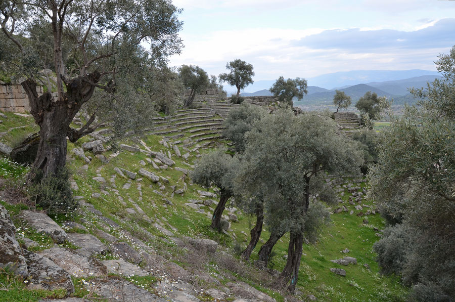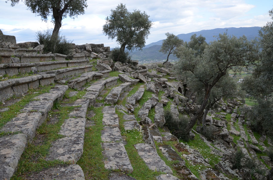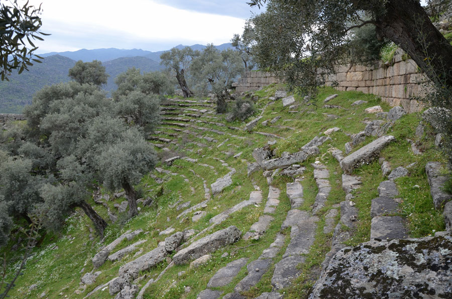 The well preserved Hellenistic theatre from the 2nd century B.C. is located on the upper slope left above the Agora with the former market building. |